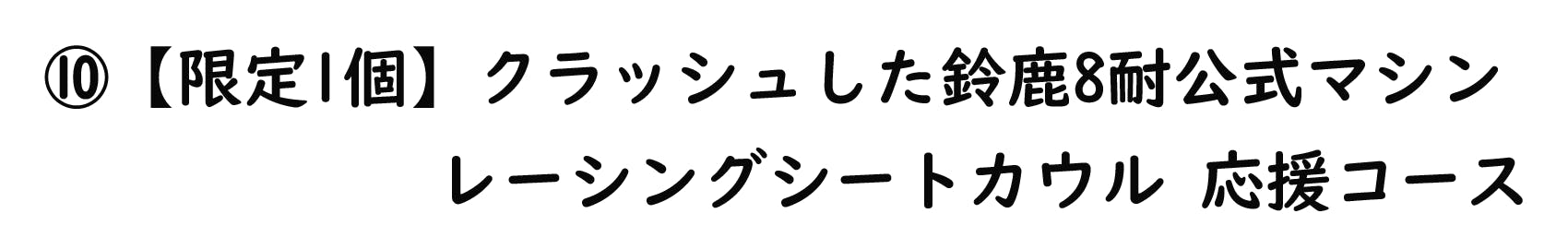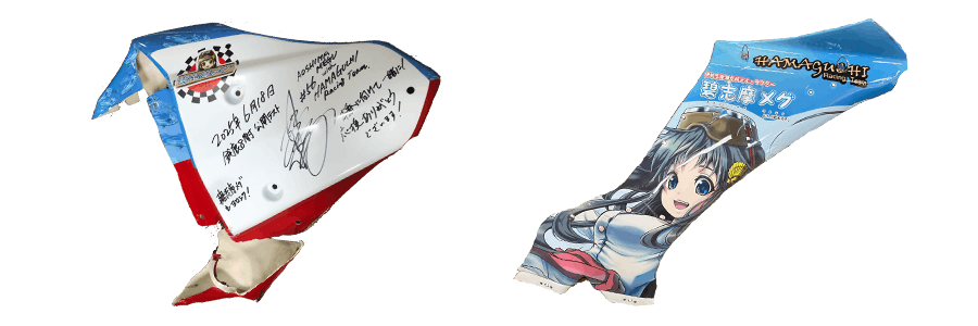 シケインでのクラッシュで使用されていた『鈴鹿8耐レーシングマシン』碧志摩メグ痛バイクの記念すべき、1号車(プロトタイプデザイン)⑩シートカウル(在庫終了)と⑪サイドカウルに直筆サインメッセージ入りを応援グッズとしてご用意させていただきます。世界に1個しかない貴重なものになります。