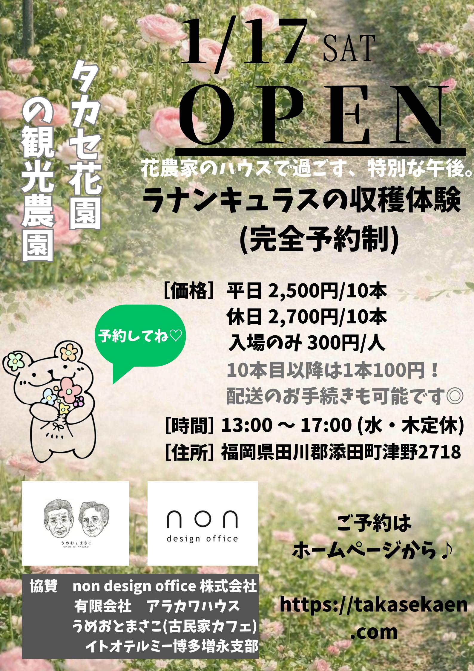 2026/01/16 18:00こんにちは、タカセ花園です!このたび、タカセ花園の観光農園がいよいよ明日 1/17(土)にオープンすることになりました!準備期間は長くもあり短くもありましたが、無事にオープンの日を迎えられたのは、クラウドファンディングで応援してくださった皆さまのおかげです。皆さまの温かいお気持ちが、私たちの原動力になっています。本当にありがとうございます!オープンにあわせて、ホームページからご予約可能になっています。https://takasekaen.com/%e8%a6%b3%e5%85%89%e8%be%b2%e5%9c%92%e4%ba%88%e7%b4%84/直売目当てでのご来園も大歓迎です!実際の畑で咲く花の様子を、ぜひ楽しんでいただけたら嬉しいです。なお、クラウドファンディングのリターンが万が一届いていない場合は、お手数ですがご連絡をお願いいたします。これからも、花と向き合いながら丁寧に育てていきます。引き続き、応援よろしくお願いいたします! もっと見る