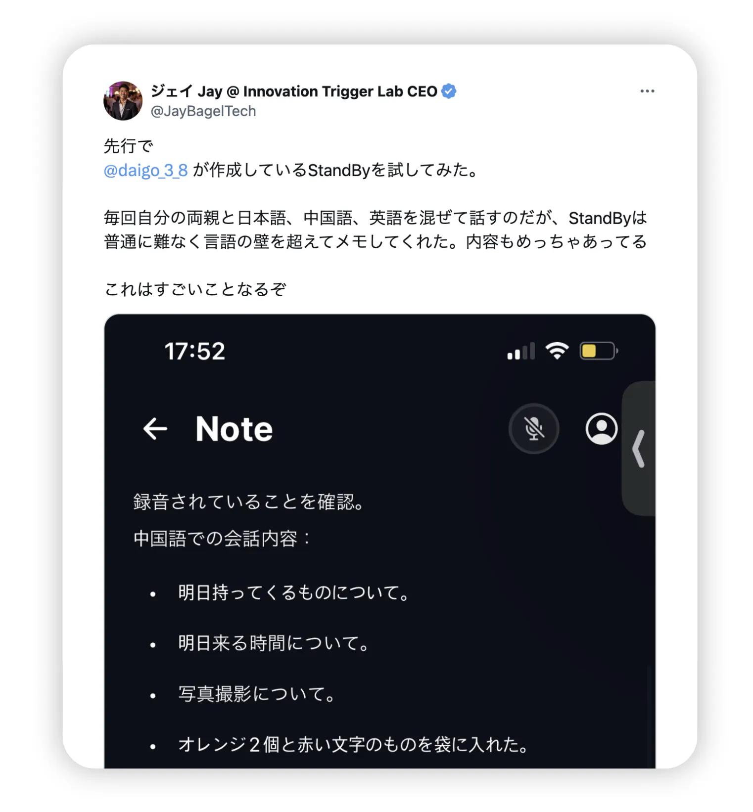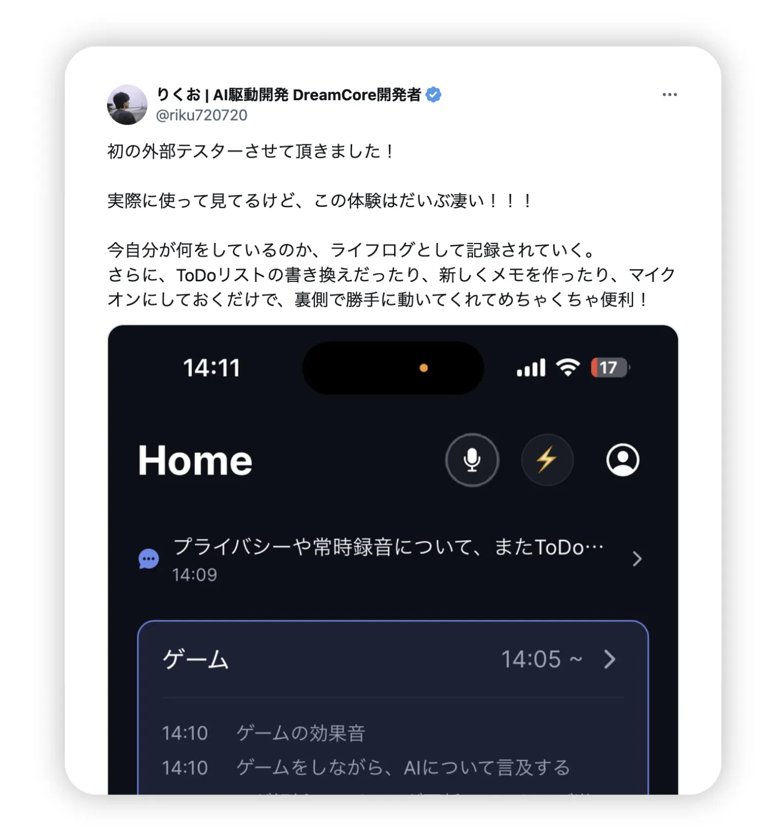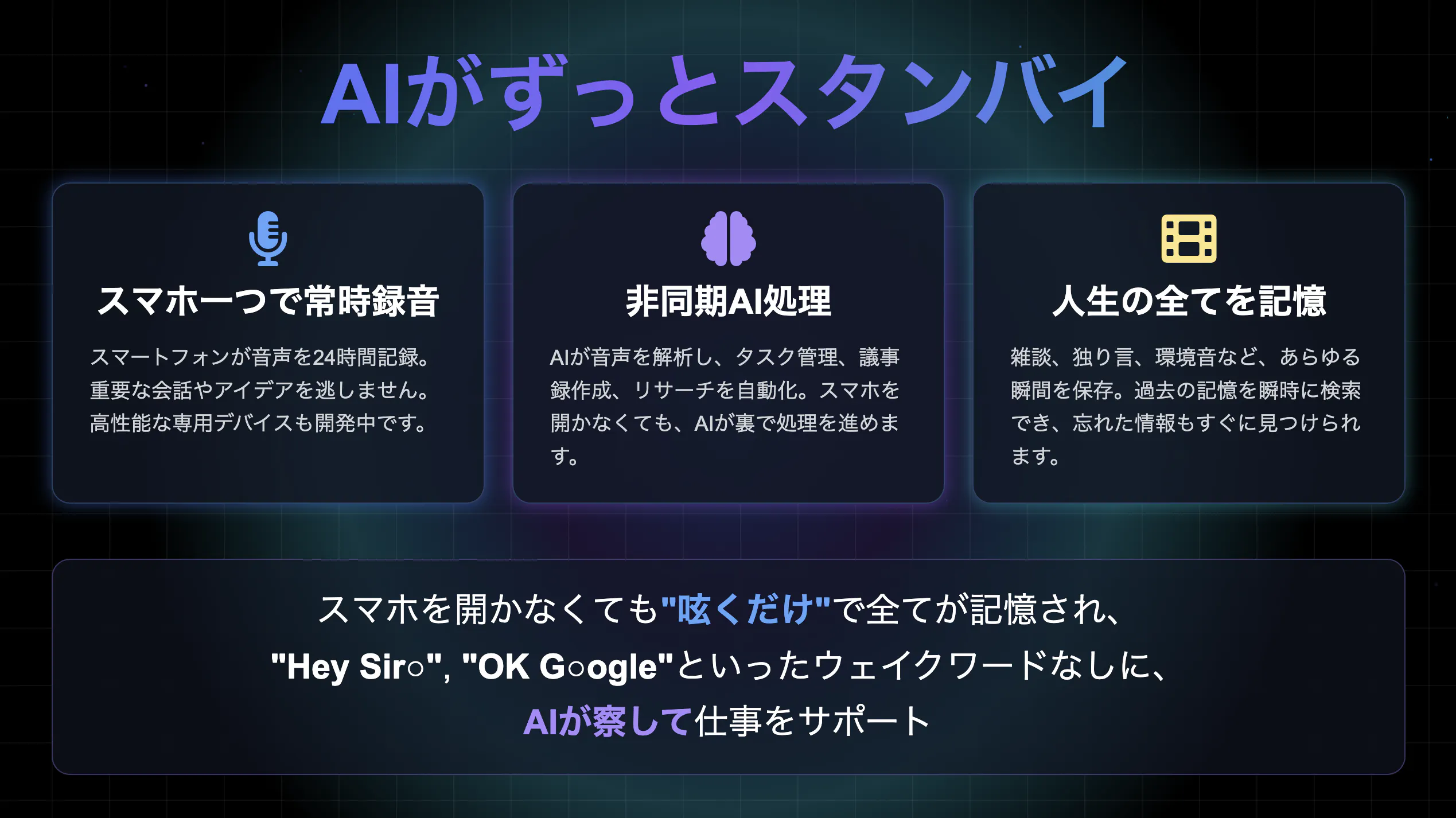 スマホを開かなくても“呟くだけ"で全てが記憶され、AIが察して能動的にタスクを実行します。