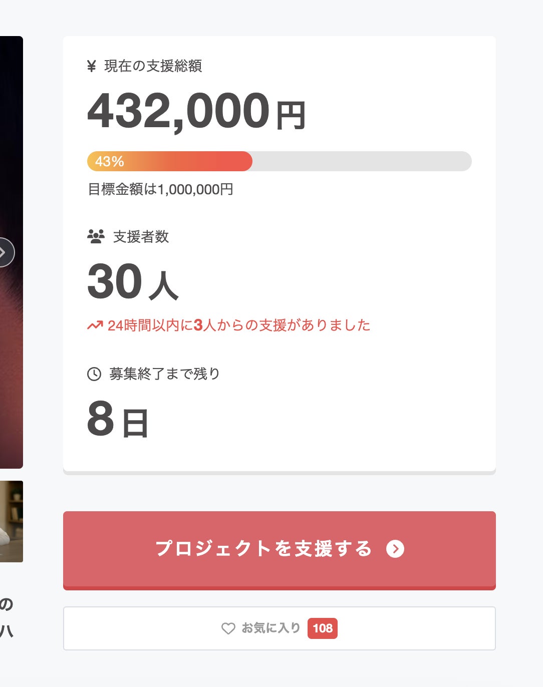 おかげさまで、支援総額43万円、支援者数30名、お気に入りの数が100を突破しました!!!