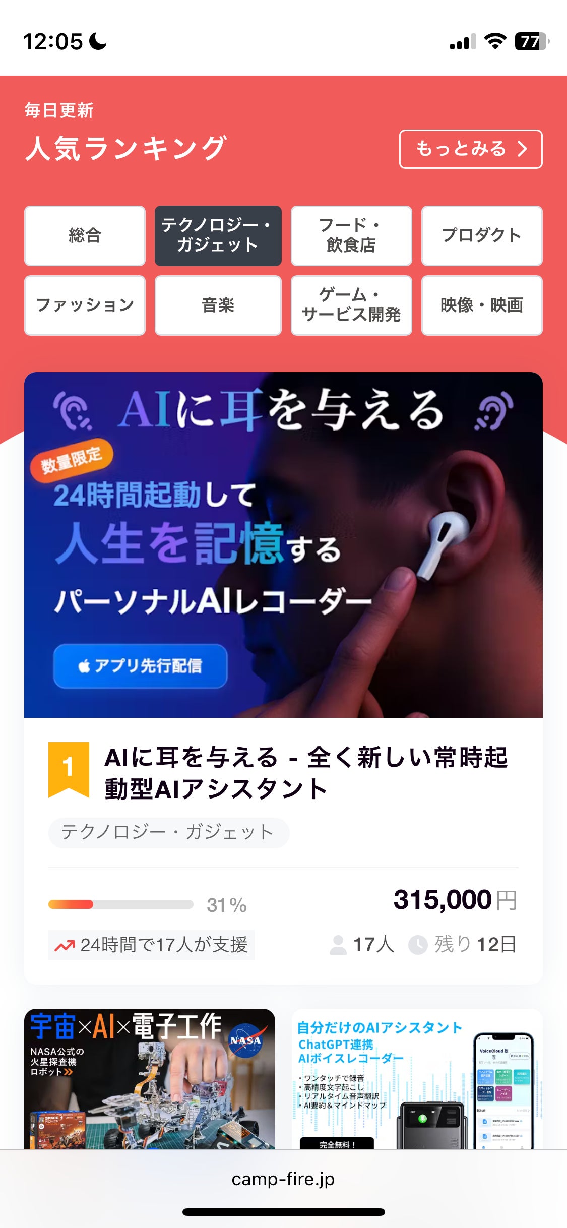 公開1時間にして早くもテクノロジー・ガジェットカテゴリで人気表示になりました!初速でご支援いただいた皆様、本当にありがとうございます!!!この調子で2週間の短期決戦、走り切ります!