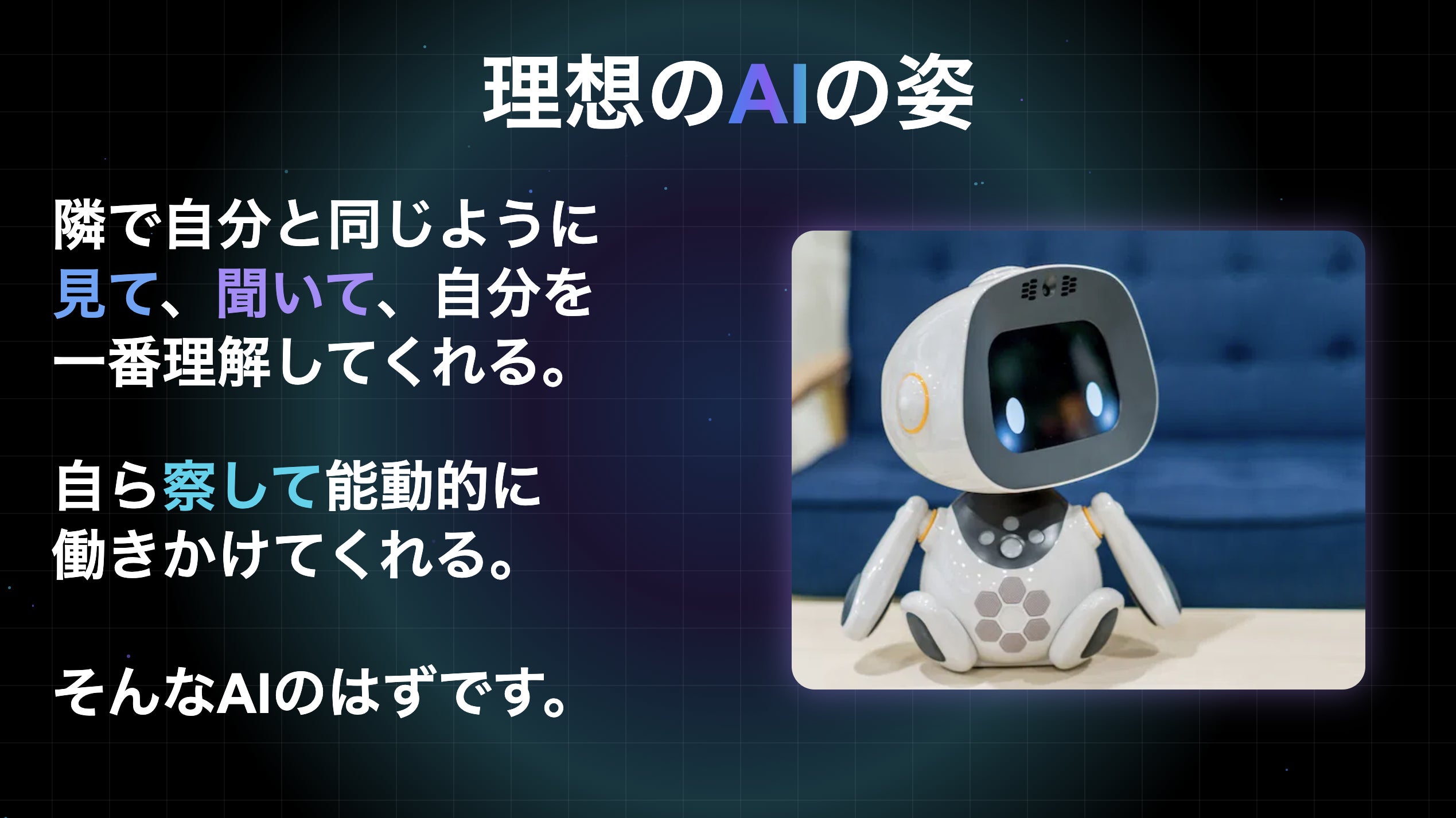 もしAIが自分と同じよう見て、聞いていれば、AI側が察して能動的に働きかけてくれるはずです。