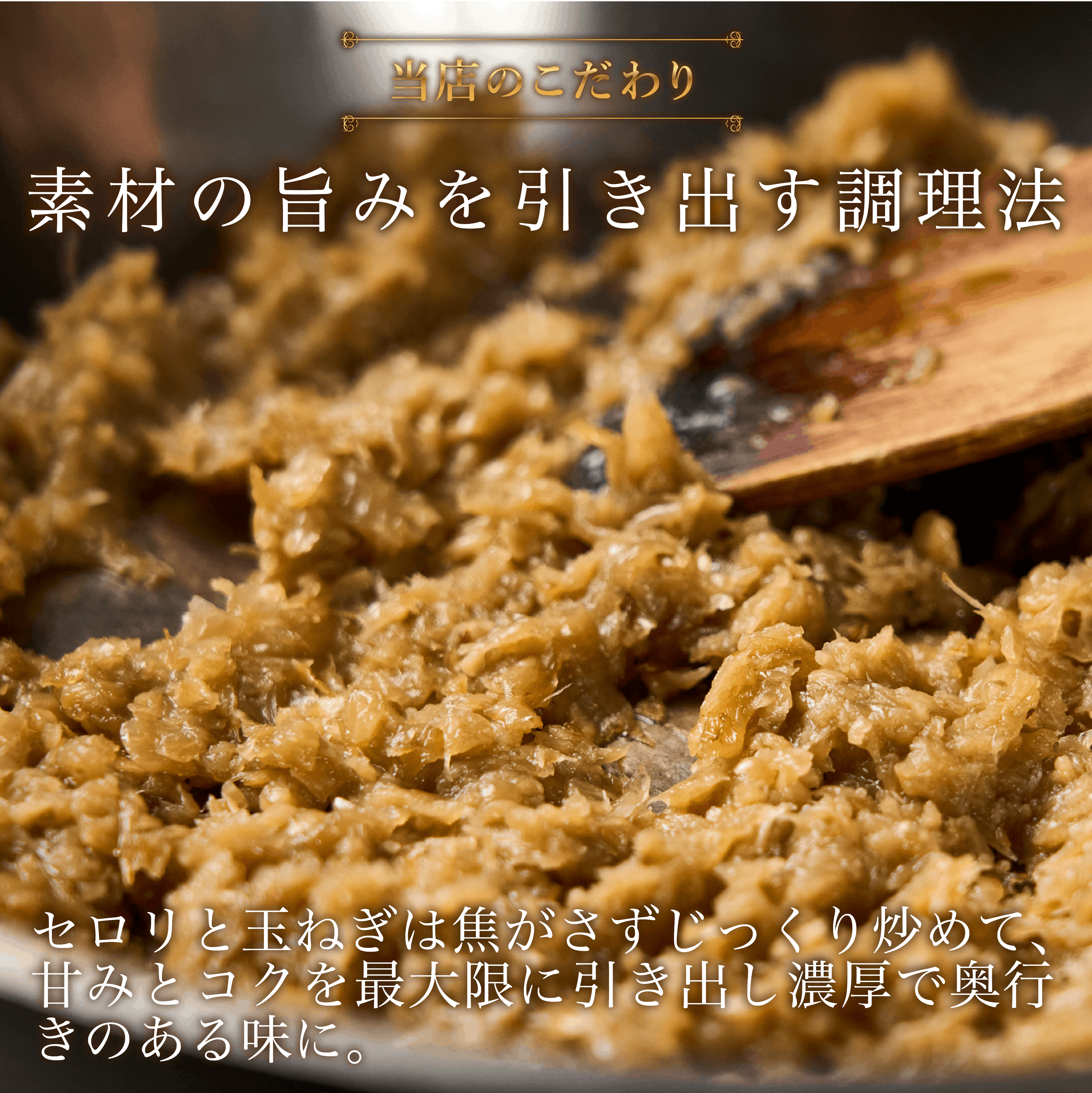ローストビーフの旨みと食感を最大限に引き出すため、肉は手動で粗みじんに。野菜は飴色になるまで炒め、冷ましてから丁寧に合わせています。