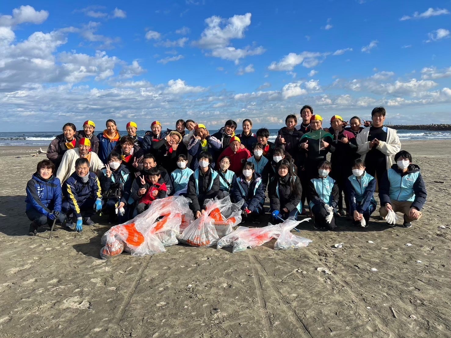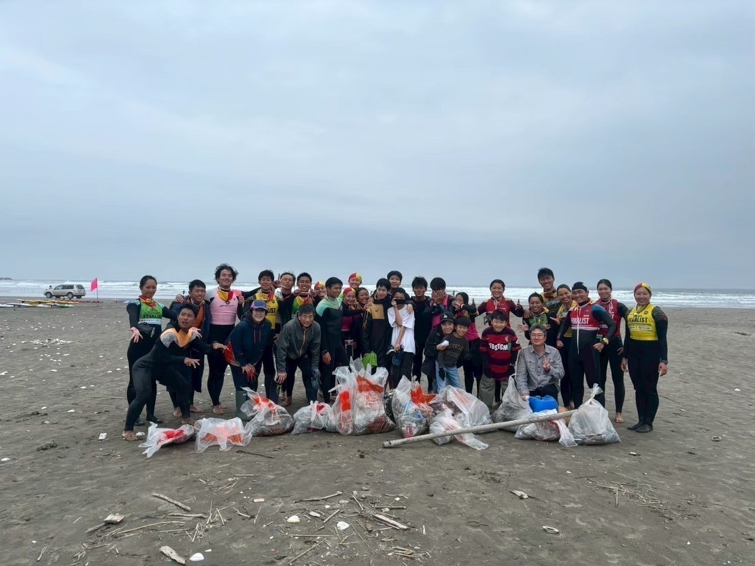 毎練習会の初めに、活動する浜でビーチクリーン活動を行っています。また、毎月第一日曜日午前9時から30分間のビーチクリーンイベントを開催し、地域のご家族連れや企業の方、サーファーさんと共に鹿嶋の海浜美化を手掛けています。