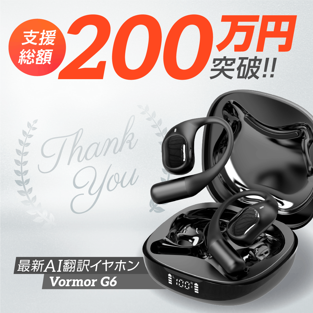 おかげさまで本プロジェクト「AI翻訳イヤホン Vormor G6」は、支援総額200万円を突破いたしました!皆さまからの温かいご支援と応援の声に、チーム一同心より感謝しております。