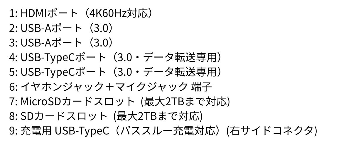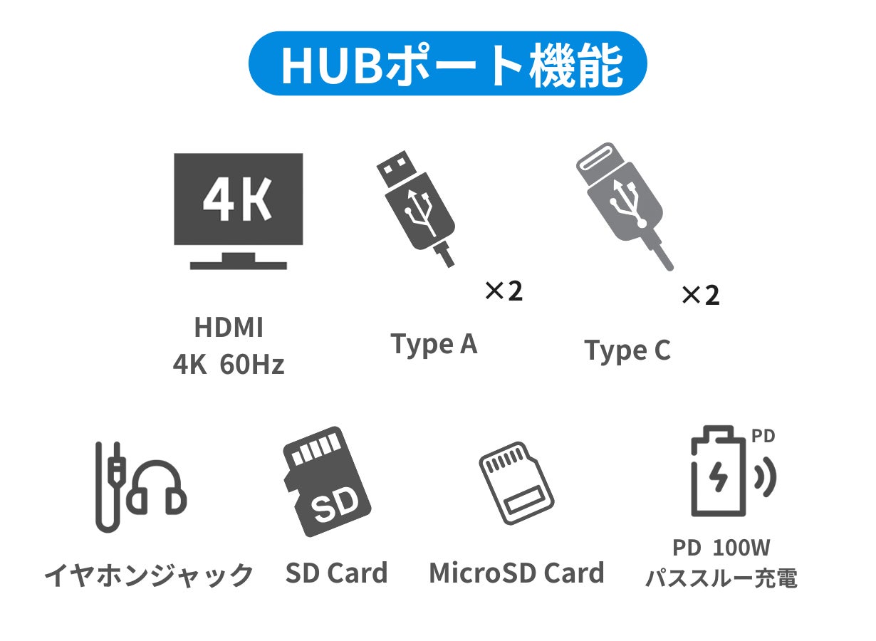 ※HUB機能利用時はTypeCケーブルで左側コネクタ(USB-TypeC)とPCを接続します