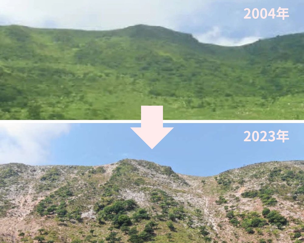 伊吹山は全山が特殊な石灰岩の地質であり、世界的にも貴重な草原生態系を育んできました。しかし、ニホンジカの食害により草原植生が失われ、土砂崩れのリスクが年々高まっています。