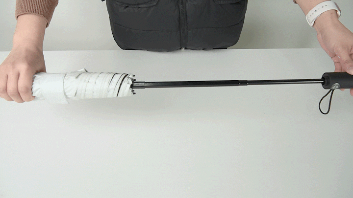 これにより、傘布を簡単にしっかり巻き取ることができ、コンパクトにまとめられます。収納袋にもスムーズに入れられるので、煩わしさを感じることなく快適に使えます。