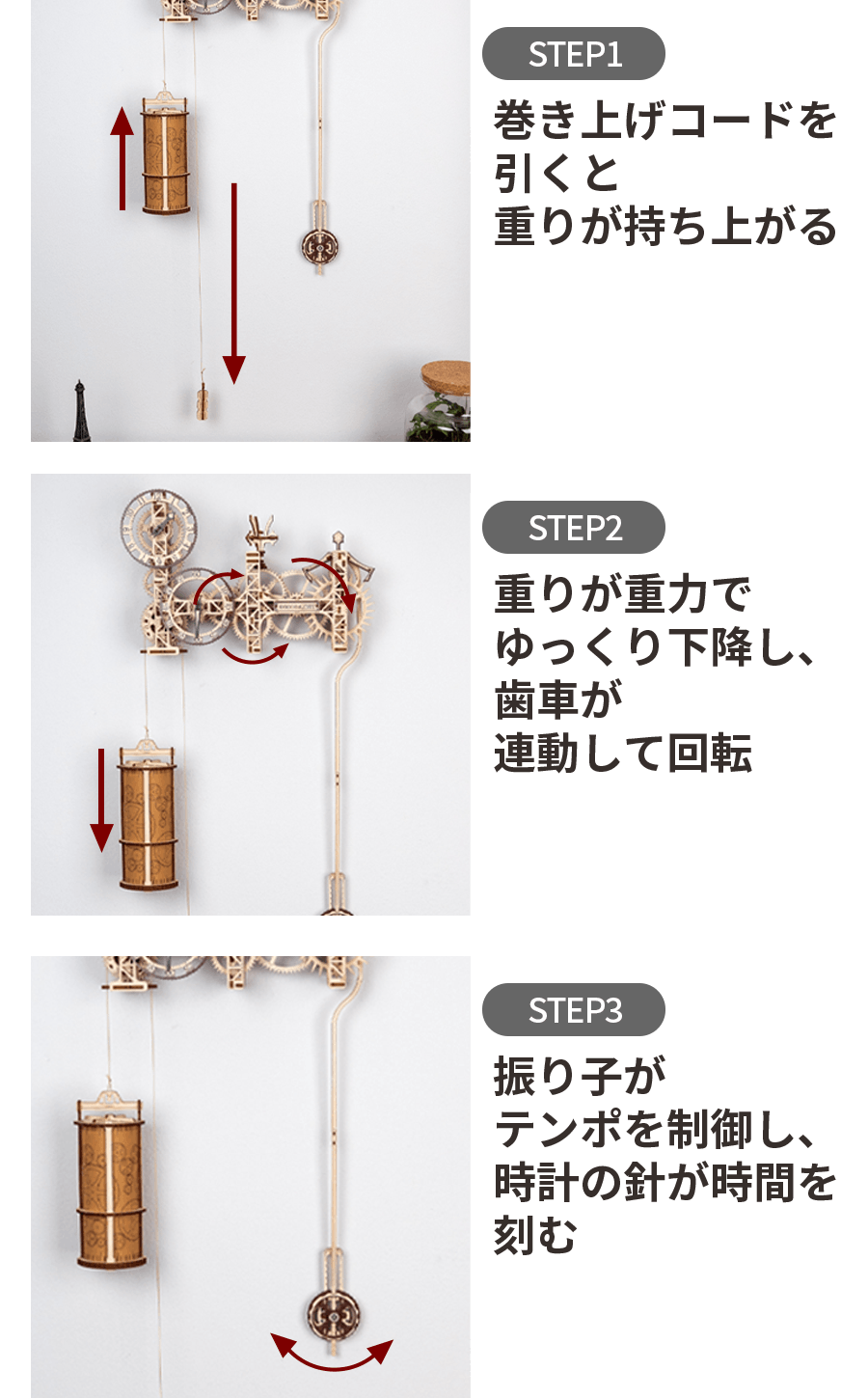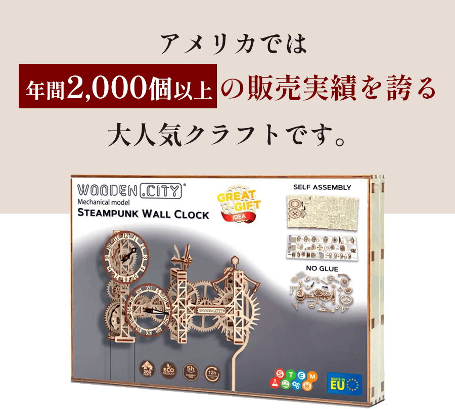 電池いらず。重りと振り子で動くスチームパンク調の木製壁掛け時計。269ピースを組み上げる達成感と、約12時間続く心地よい“カチカチ”の音色。工具・接着剤不要、動画と日本語補助シートで初めてでも楽しめます。