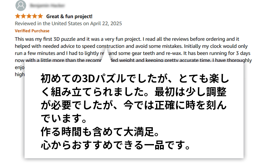 • お世話になっております。商品の検品が完了し、本日11/26(水)に全ての支援者さまへ配送が完了いたしました。お住まいの地域によりヤマト運輸または佐川急便で順次お届けしておりますので、到着まで今しばらくお待ちください。万が一、配送完了から7日経過しても届かない場合は、・公式LINE(https://lin.ee/qykO6RI)・メール(info@kittosin.com)よりご連絡ください。商品には組立動画のQRコードを同梱しております(https://www.youtube.com/watch?v=thbfM083e18&t)。動画をご覧いただきながらゆっくりと組み立てをお楽しみください。また、組み立てたパーツはどの部品か分かるよう保管していただくと、最終段階でスムーズに組み立てられます。本製品は精密な木製時計のため、組み立て時に小さなパーツが欠けたり破損する場合がありますが、交換パーツは無償でお送りしております(複数回の交換や大きなパーツなど一部送料をご負担いただく場合があります)。特にAの板は破損しやすい部分ですが、その後は比較的大きなパーツが多く破損の可能性は低くなります。複数の破損があった場合はまとめてお届けも可能ですので、公式LINEよりお気軽にご相談ください。お問い合わせの際は、・ご注文者名・注文ID・希望パーツ番号・破損箇所の写真(可能であれば)をお知らせいただくとスムーズです。Steampunk Wall ClockはWOODEN.CITYの中でも難易度の高いモデルですが、精密だからこそ組み上げたときの達成感は格別です。サポート体制を整えておりますので、安心して組み立てをお楽しみください。改めまして、ご支援いただき誠にありがとうございました。今後も皆さまの暮らしを豊かにする商品をお届けしてまいります。 もっと見る
