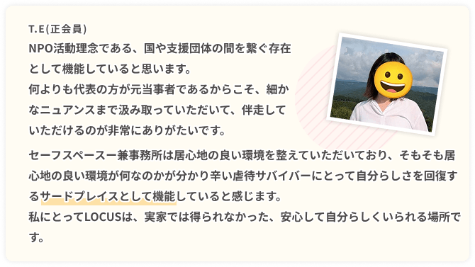 成人サバイバーが受けている虐待環境からの安全な脱出を支援するとともに、心身の回復と社会復帰ができるよう、大切に活用させていただきます。