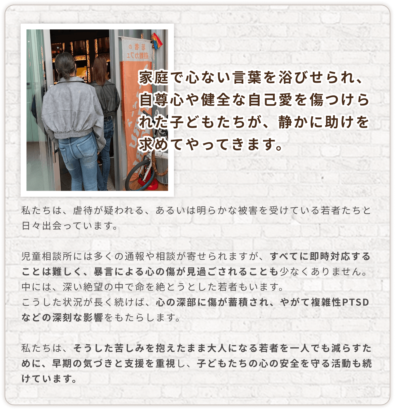 家庭で虐待を受け、成人後も親元から離れられない若者を保護し、医療や福祉に繋げたい。