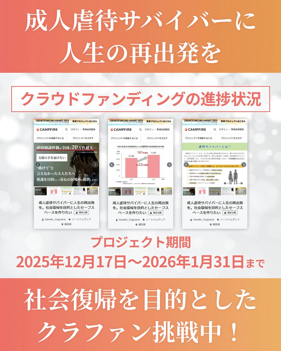 こんにちは、「成人虐待サバイバーに人生の再出発を。社会復帰を目的としたセーフスペースを作りたい」の杉山です。