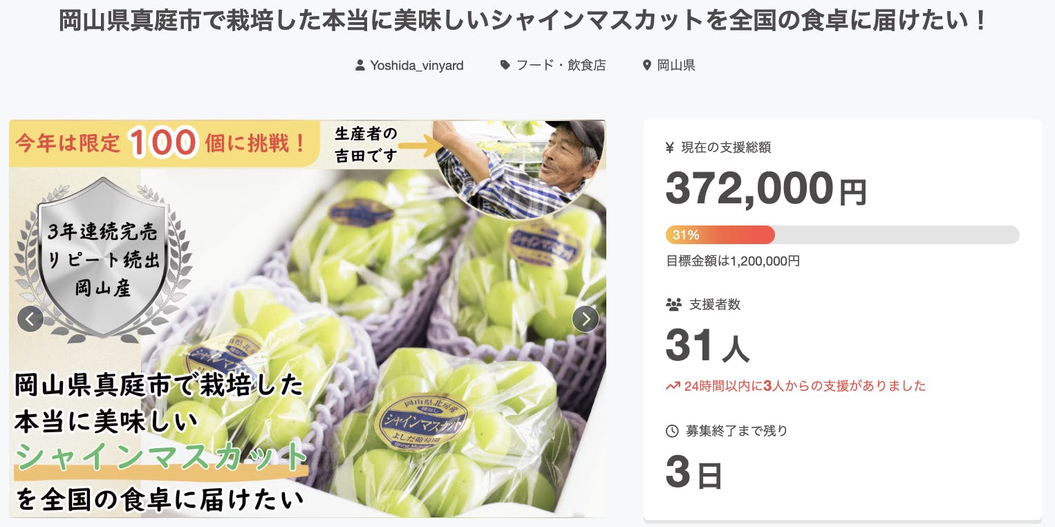 終了まであと3日!目標の支援者100人まであと69人!