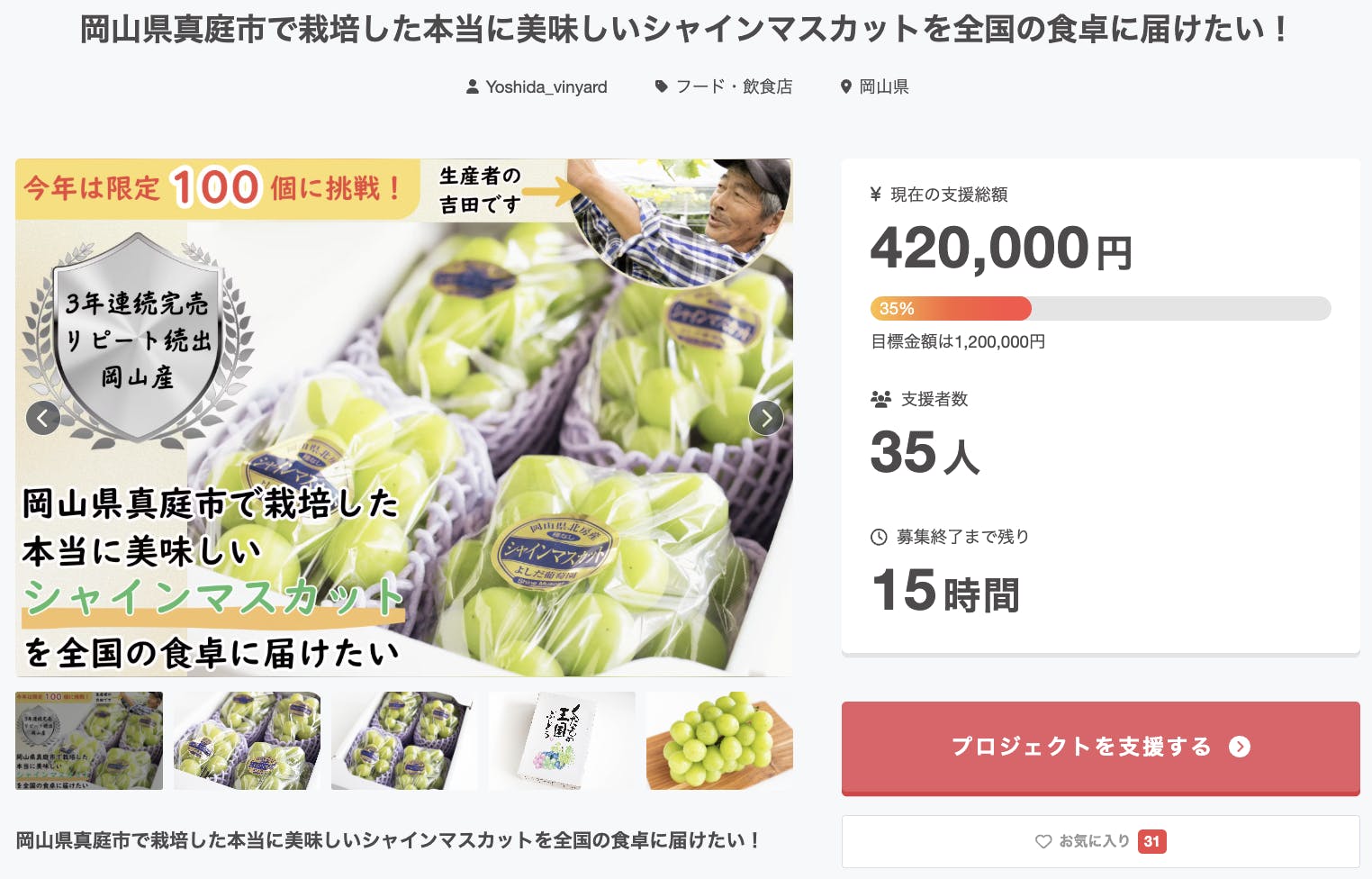 2025/07/16 15:06お世話になっております。よしだ葡萄園の吉田です!岡山県北の真庭市でもすっごく暑いです!皆さんは体調お変わりないですか?さてさて、クラウドファンディングも残り15日、100個の完売まで77個となりました!やっぱり100個は多かったみたいです!でも最終日まで諦めないですよ〜!ぜひよしだ葡萄園を応援してください!何卒よろしくお願いいたします。 もっと見る