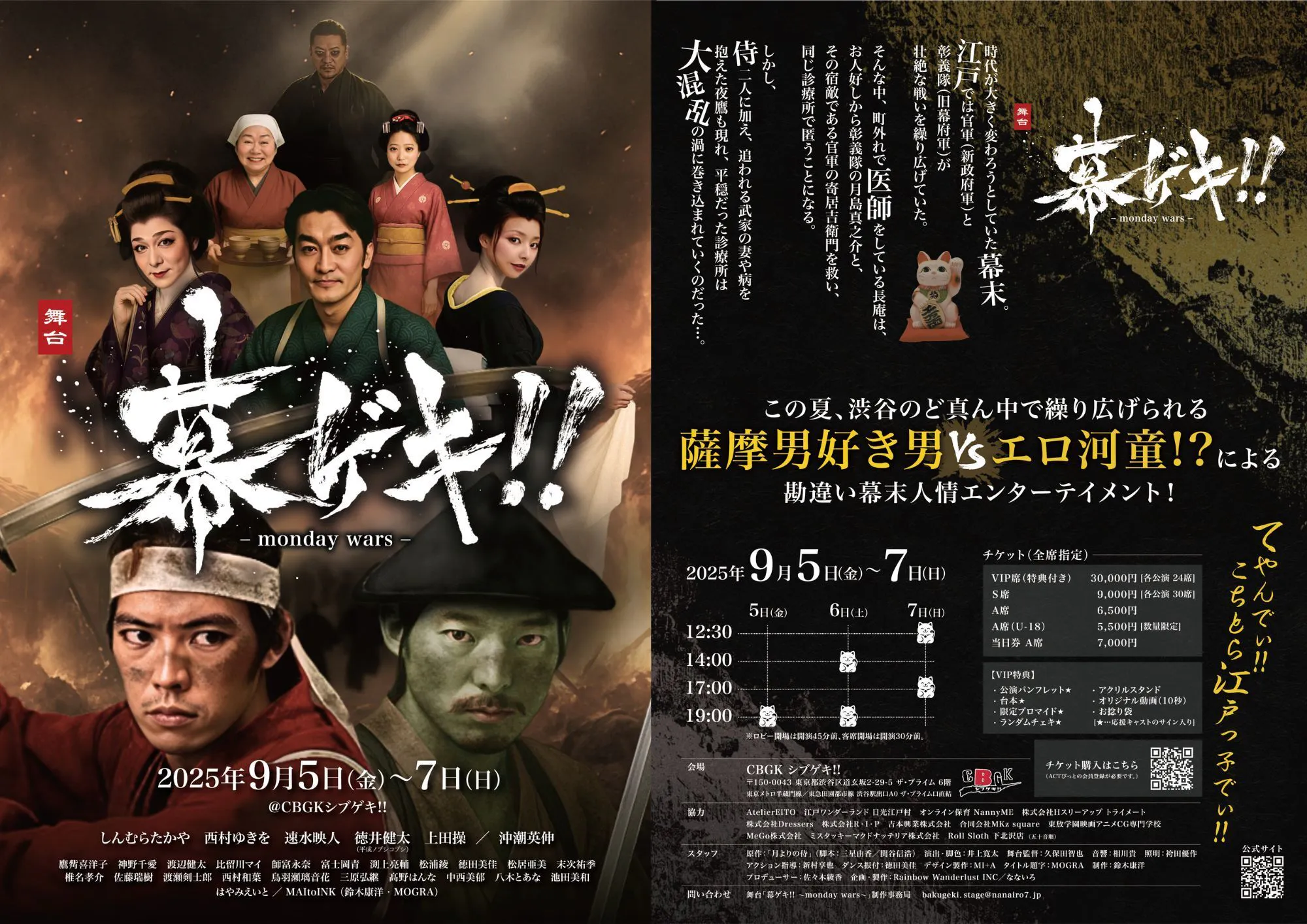 2025/09/03 12:00ご支援くださった皆さまへこの度は、私たちのクラウドファンディングプロジェクトに温かいご支援と応援をいただき、心より御礼申し上げます。皆さまからいただいたご声援が、私たちの大きな励みとなり、ここまで歩みを進めることができました。プロジェクトは終了いたしましたが、現在、その舞台の稽古は終盤を迎え、いよいよ間もなく開演の時を迎えようとしています。日々一歩一歩積み重ねてきた努力がカタチとなる瞬間を、皆さまと共有できることを楽しみにしております。公演の詳細やチケット情報などは、また改めて活動報告や公式SNS等でお知らせしてまいりますので、ぜひ引き続きご注目ください。これからも夢の実現に向けて全力で挑戦してまいりますので、変わらぬご支援と応援をどうぞよろしくお願いいたします。心からの感謝を込めて。舞台「幕ゲキ!! 〜monday wars〜」幕末の江戸を舞台にした人情時代劇。歌唱、ダンス、アクション、殺陣など、多彩な演出要素を取り入れた、笑いあり涙ありのエンターテインメント作品です。 ■あらすじ時代が大きく変わろうとしていた幕末。江戸では官軍(新政府軍)と彰義隊(旧幕府軍)が壮絶な戦いを繰り広げていた。そんな中、町外れで医師をしている長庵は、お人好しから彰義隊の月島真之介と、その宿敵である官軍の寄居吉衛門を救い、同じ診療所で匿うことになる。しかし、侍二人に加え、追われる武家の妻や病を抱えた夜鷹も現れ、平穏だった診療所は大混乱の渦に巻き込まれていくのだった…。 ■出演者しんむらたかや/西村ゆきを速水映人/徳井健太(平成ノブシコブシ)/上田操鷹觜喜洋子/神野千愛/渡辺健太/比留川マイ/師富永奈/富士岡青/渕上亮輔松浦綾/徳田美佳/松居亜美/末次祐季/椎名孝介/佐藤瑞樹/渡瀬剣士郎西村和葉/鳥羽瀬璃音花/三原弘継/髙野はんな/中西美郁/八木とあな/池田美和沖潮英伸 ■パフォーマンス出演はやみえいと/MAItoINK(鈴木康洋・MOGRA) ■公演概要脚本:三星由香/関谷信浩演出・脚色:井上寛太プロデューサー:佐々木綾香 会場:CBGKシブゲキ!!(東京都渋谷区)日程:2025年9月5日(金)〜7日(日) 全5公演 9月5日(金) 開場 18:30/開演 19:009月6日(土) 開場 13:30/開演 14:00 開場 18:30/開演 19:009月7日(日) 開場 12:00/開演 12:30 開場 16:30/開演 17:00※ロビー開場は開演45分前、客席開場は開演30分前。 ■チケット【VIP席】 ¥30,000- ※特典あり/各公演24席【S席】 ¥9,000- ※各公演30席【A席】 ¥6,500- ※当日券¥7,000-【A席(U-18)】¥5,500- ※数量限定https://act-pit.com/events/view/?eid=dfQQFYEv もっと見る