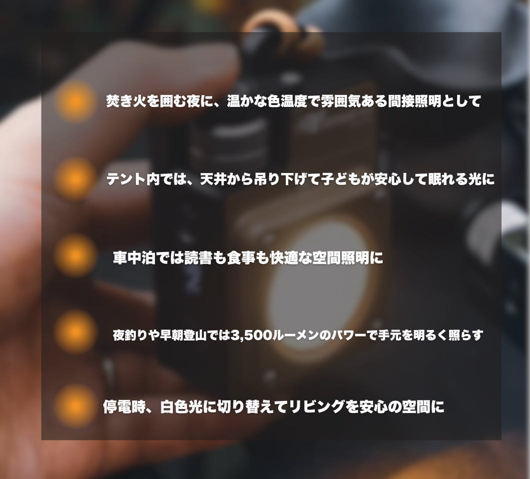 焚き火のそばでは暖色モードで雰囲気を壊さずに手元を照らす間接照明として