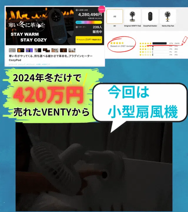 今回の新製品である「Venty Clip Fan」も海外クラウドファンディングで1000万円以上の売り上げがあり、洗練されたデザインが人気を博しています。
