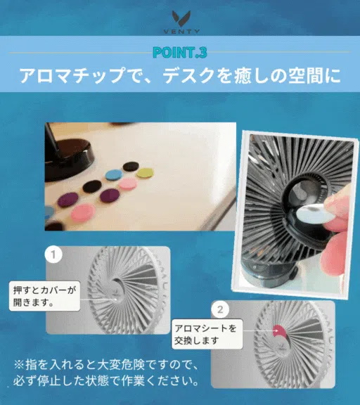 専用アロマチップでデスクを癒しの空間に専用アロマチップで、アロマ送風機としての利用も可能です。風量を調整し、お好みの香りをお楽しみください。専用チップはバリエーション豊富で、CAMPFIREで購入頂いた皆様にはアロマチップを同梱してお届けします。
