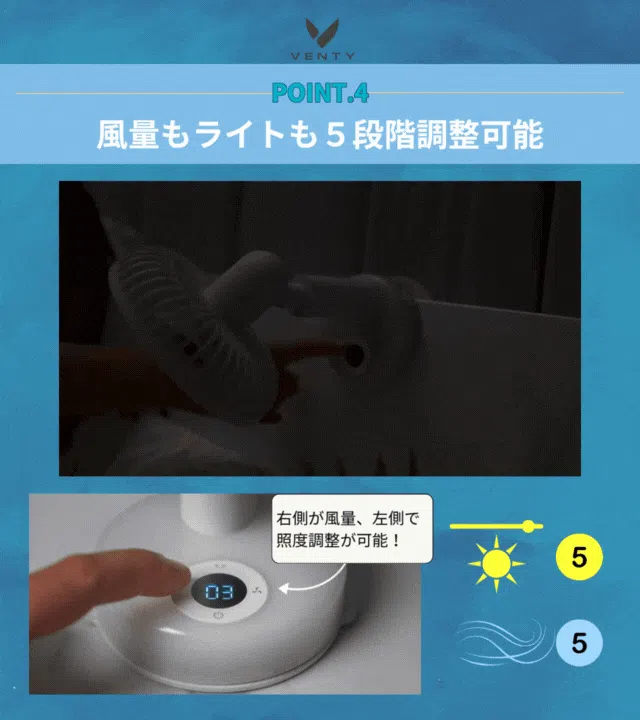 風量/照度も嬉しい5段階調整が可能でボタンを押すだけのカンタン調整となっています。また、風量も目でわかりやすいデジタル画面で表示されるためお好みの風量や照度を目視で確認できます。