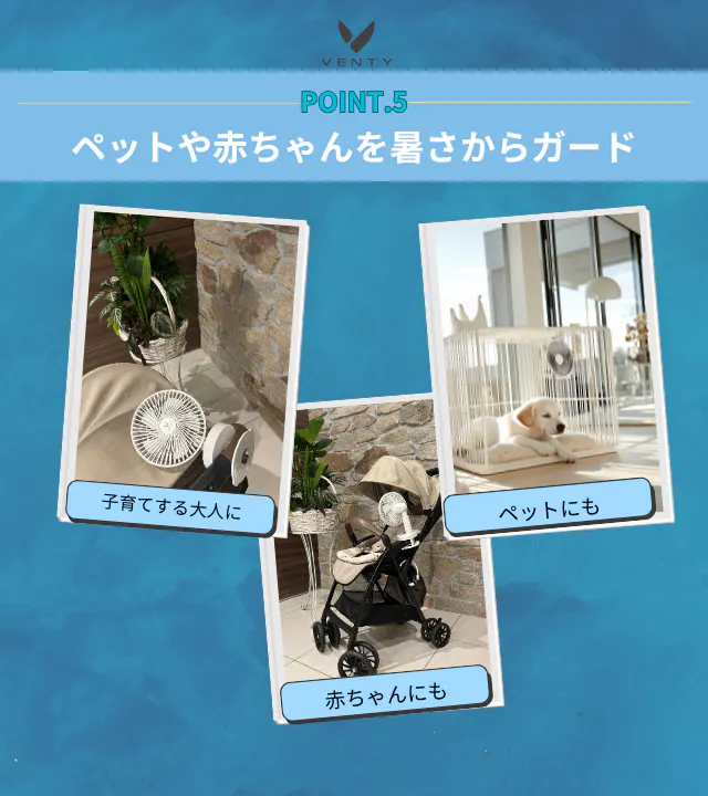 夏のベビーカーはとっても暑い!ベビーカーにも挟めるCLIPで大人に赤ちゃんにしっかり送風!また、夏バテしているペットにも涼しい風を送ってあげられます。