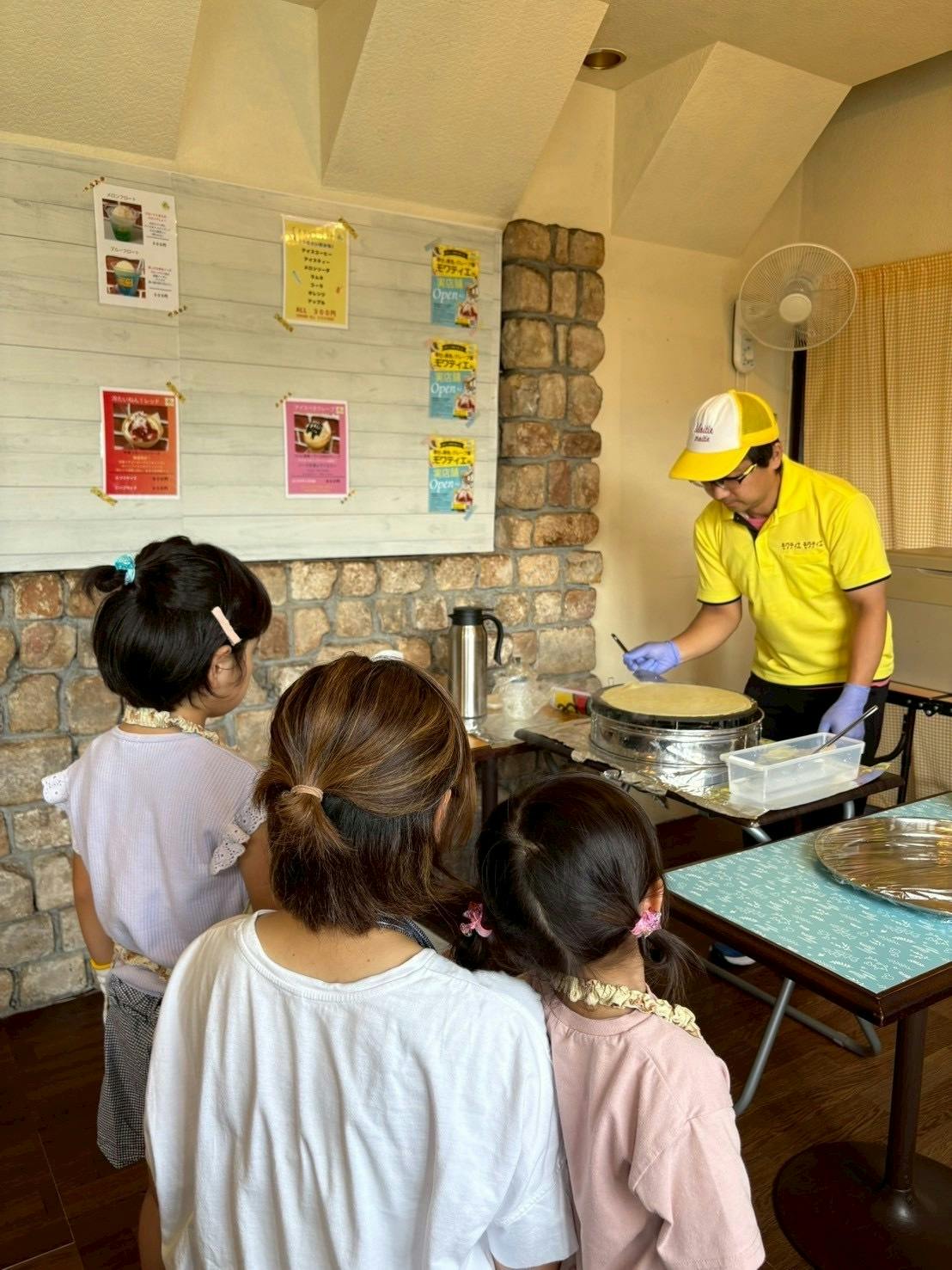 始めにクレープ焼き体験についての説明・見本・注意をお話してから、実際に焼き体験をしてもらいました。小学生のお子さんは1人で焼いたり、小さいお子さんはお母さんが一緒に焼いたり、もちろんお母さんにも体験してもらいました。始めは丸にならなかった生地も、少ししたらみんなコツをつかんでとても上手に焼けていました!