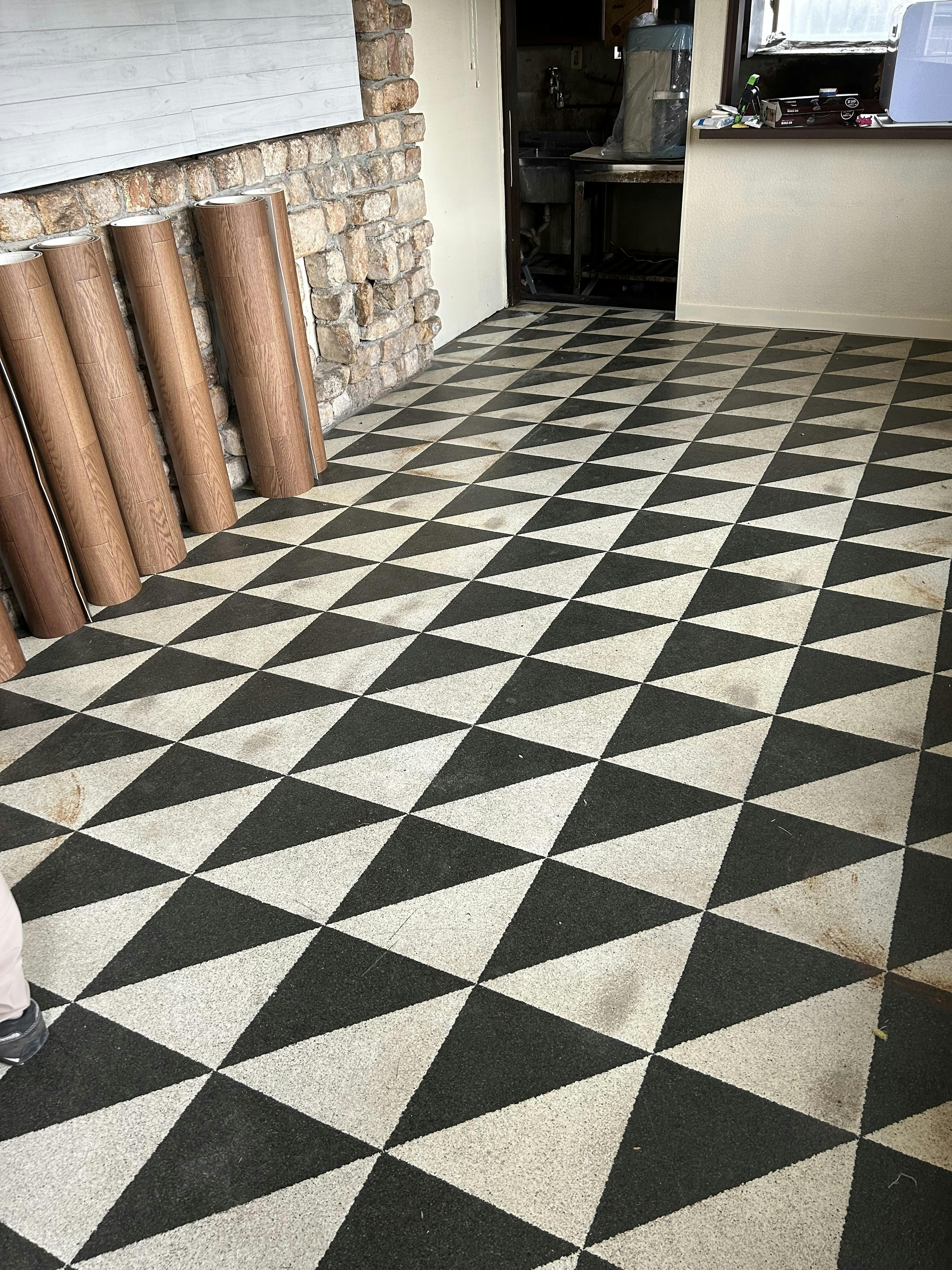 次はイートインスペースのメインになる床。インテリアコーディネーターさんからプロの意見をいただき、落ち着いた色目にしようと決めて、買い出しに行ったのですが、なかなか色が揃わず…。