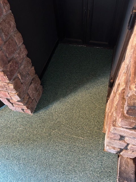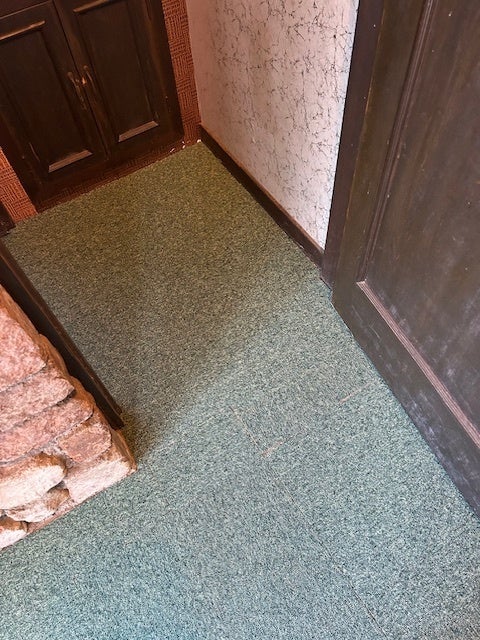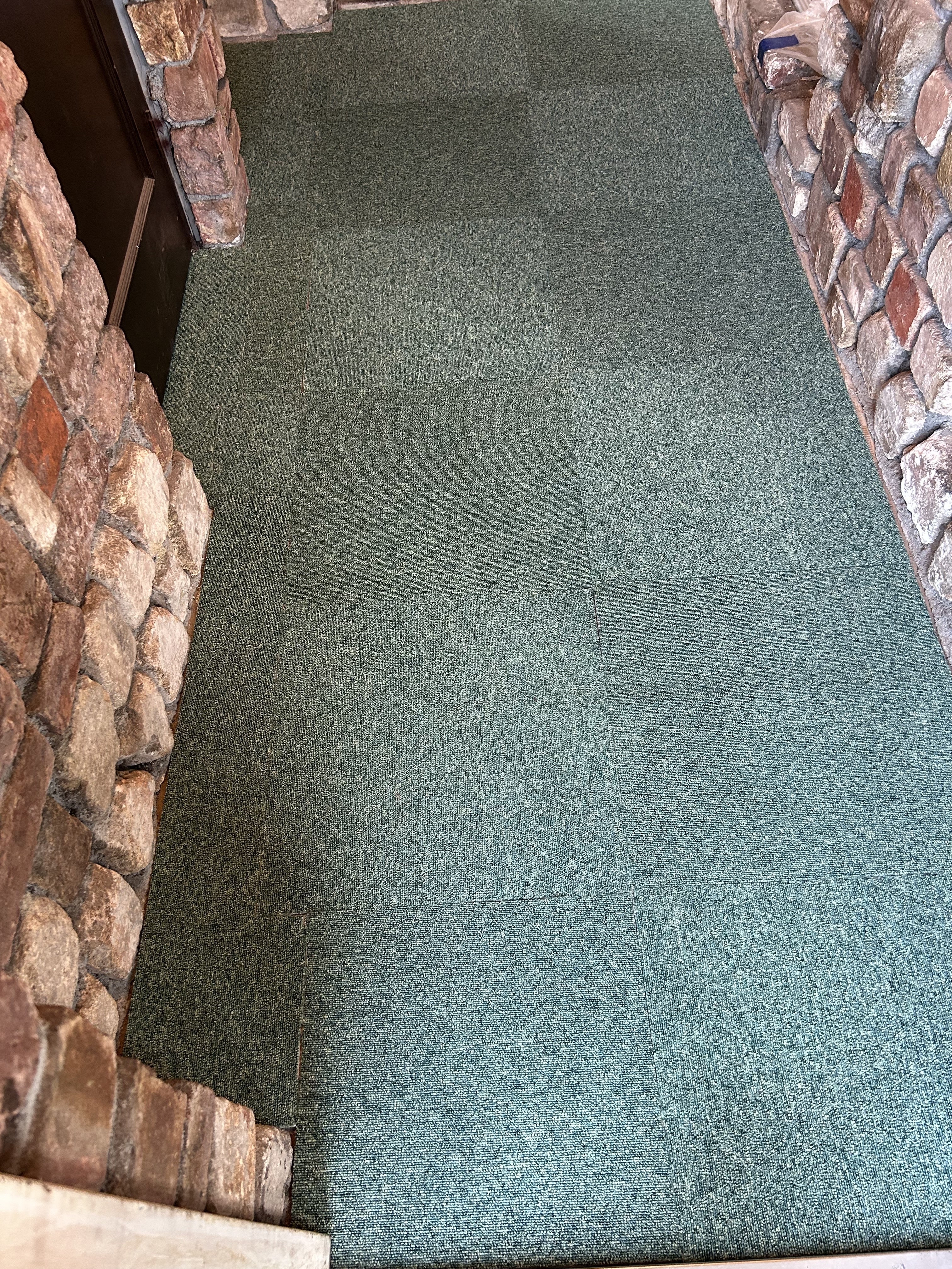 この場所は、以前ベコベコだった床を貼り替えた場所です。上から緑のマットを置いてみると、いい感じ!向きを変えて置くとチェック柄みたいでさらにいい感じ!!