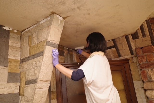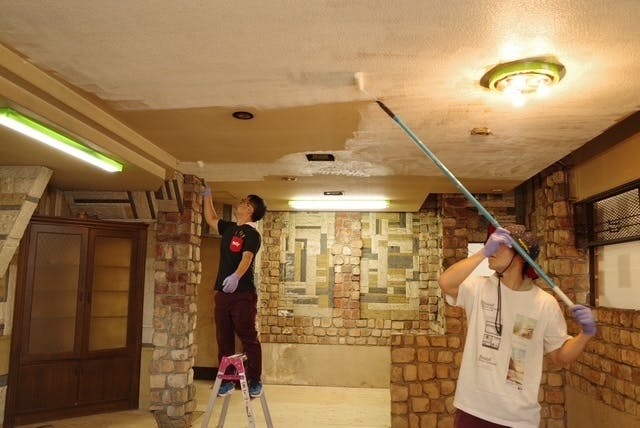 まだ塗れていなかった奥のスペースの天井と壁も塗りました!デコボコした素材だったので、何気に時間がかかりました(汗)当然なのですが、天井は上を向かないと塗れません。でもずっと上を向いていると首が痛くなるので、時々交代しながらみんなで塗りました。