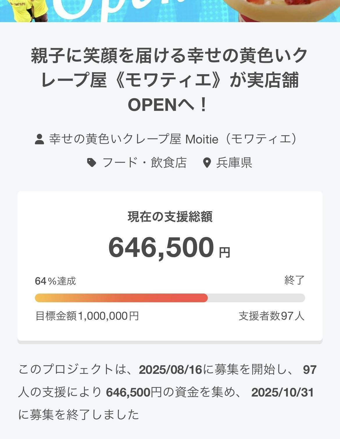 2025/11/02 10:00クラウドファンディング挑戦、終了しました!本当にたくさんのご支援・応援をいただき、本当に本当にありがとうございました!!めっちゃ嬉しかったです‼どれだけ励みになったことか…感謝してもしきれません。クラウドファンディングを始めた時は、いろいろな葛藤もあり、何よりプレッシャーが大きかったです(汗)1人も応援してくれなかったらどうしようとか、私たちなんかがこんな大それたことをしてどう思われるだろうかとか、いろいろな思いがありました。でも山の奥からの応援があったり、家族みんなで応援してくれたり、行く先々で「頑張ってください!」「応援しています!」のお声をいただいたり、本当にありがたかったです!そのおかげで前を向いて自分たちが出来る最大限のことをやることができたと思っています‼時に人と比べて落ち込んだり、頑張れない時があったりもしましたが、応援してくれる声を信じて、自分たちの力を信じて突っ走れた2ヶ月半でした。数字だけ見ると達成率は64%なのですが、私たちにとって、このクラウドファンディング挑戦は、120%の幸せをもらうことができた、かけがえのない挑戦でした‼声を大にして言いたい!!「クラファン大成功でした!!」他の誰でもない、自分たちが言うのだから、誰が何と言おうと言われようと、それが真実‼応援してくれたたくさんの方々へ感謝を伝えられるよう、店舗改装作業を頑張っていきます!私たちの挑戦はまだまだ続きます。大変なことが山積みですが、楽しんで笑って生きていくぞー‼ご支援いただいた方々へのお礼やリターン品について、これから準備してお送りさせていただきますので、引き続きどうぞよろしくお願いいたします!最後に、私たちの挑戦が誰かの勇気に、背中を押す一歩に、繋がってくれることを願っています!! もっと見る