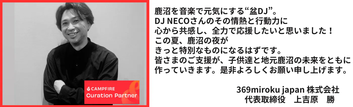 【イベント当日の様子】栃木県鹿沼市にて「盆DJ 2025」を無事開催することができました!あいにくの大雨となった当日でしたが、予想をはるかに超える多くの方にご来場いただき、雨音すら音楽のように感じるような一体感の中で、温かな空間が生まれました。【 子どもたちは主役として大奮闘!】イベント運営、グッズ制作&販売、飲食販売にチャレンジした子どもたちは、劣悪な天候にも負けず、一生懸命に声を出し、最後まで走り切りました。完売した商品も多く、残ってしまった商品にも最後まで全力で向き合う姿が印象的でした。【音楽で心一つに‼︎】雨の中でも、DJブースから流れる音楽にあわせて踊る人々、「日光和楽踊り」での盆踊りには輪ができ、世代や背景を超えて、音でつながる瞬間が多く見られました。今回の「盆DJ」では、地域の子どもから大人まで、さまざまな立場の方がひとつになり、ダイバーシティあふれる共創の場が実現しました。「誰もが笑顔」「誰もが関われる」この祭りは、目指していた“インクルーシブなお祭り”そのものでした。【ヤグラを支えてくれた皆さんへ、改めて感謝を】 この特別な空間の中心には、皆さんのご支援によって実現した「オリジナルDJヤグラ」雨の中でも、美しく存在感を放っていたこのヤグラは、子どもたちや地域の想いが詰まった“つながりの象徴”です‼︎ご支援くださった皆様、スポンサーの皆様、本当にありがとうございました!【感謝をこめて…協力してくださった皆さまへ】・飲食出店で準備段階から当日まで、ご協力いただいた「369cafe」様、「あぜみち」様・物販サポートで支えてくださった大タカシさん・雨の中テント設営などで尽力いただいた若い有志のお兄さん達・毎年、会場を提供してくださっている「常陸屋呉服店」様そして、ご来場いただいたすべての皆さまに、心より感謝申し上げます!【子どもたちの姿から気づいたこと、見えたこと】当日は、がんばる子どもたちの姿に、保護者の皆さんの目がとても輝いていました。普段見られないような表情や行動に、成長や可能性を感じられた方も多かったようです。子どもだけでなく、大人も心動く。とても大切なことだと再確認しました!みんなでつくるお祭りの中で、子どもたちが、地域を動かす主役となっていました。『子どもが大人に気づきを!』『大人が子どもに気づきを!』気づきが増え、地域の活性化や未来に繋がると思います。【来年へ向けて】「盆DJ」はこれからも続いていきます。来年はもっと多くの人を巻き込んで、さらにパワーアップして開催したいと思っています。そしていつか、鹿沼の“交差点のど真ん中”でこのお祭りが行われる未来を目指して。引き続き、活動の応援・見守りをどうぞよろしくお願いいたします!※なお、クラウドファンディングのリターンの物品は昨日発送させていただきました。不備や不明点がありましたら、こちらまでお問い合わせください。〈new.school1820@gmail.com〉※DJ NECO MIXをお選びいただいた方へ:来週中にメールにて音源をお送りいたします。遅れてしまい申し訳ありませんが、今しばらくお待ちください。 もっと見る
