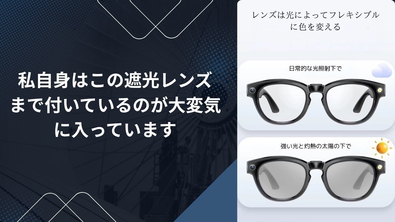 このスマートグラスは、最新技術とスタイリッシュなデザインを兼ね備えた理想的なガジェットです。日常生活をより豊かにするための必需品となるでしょう。