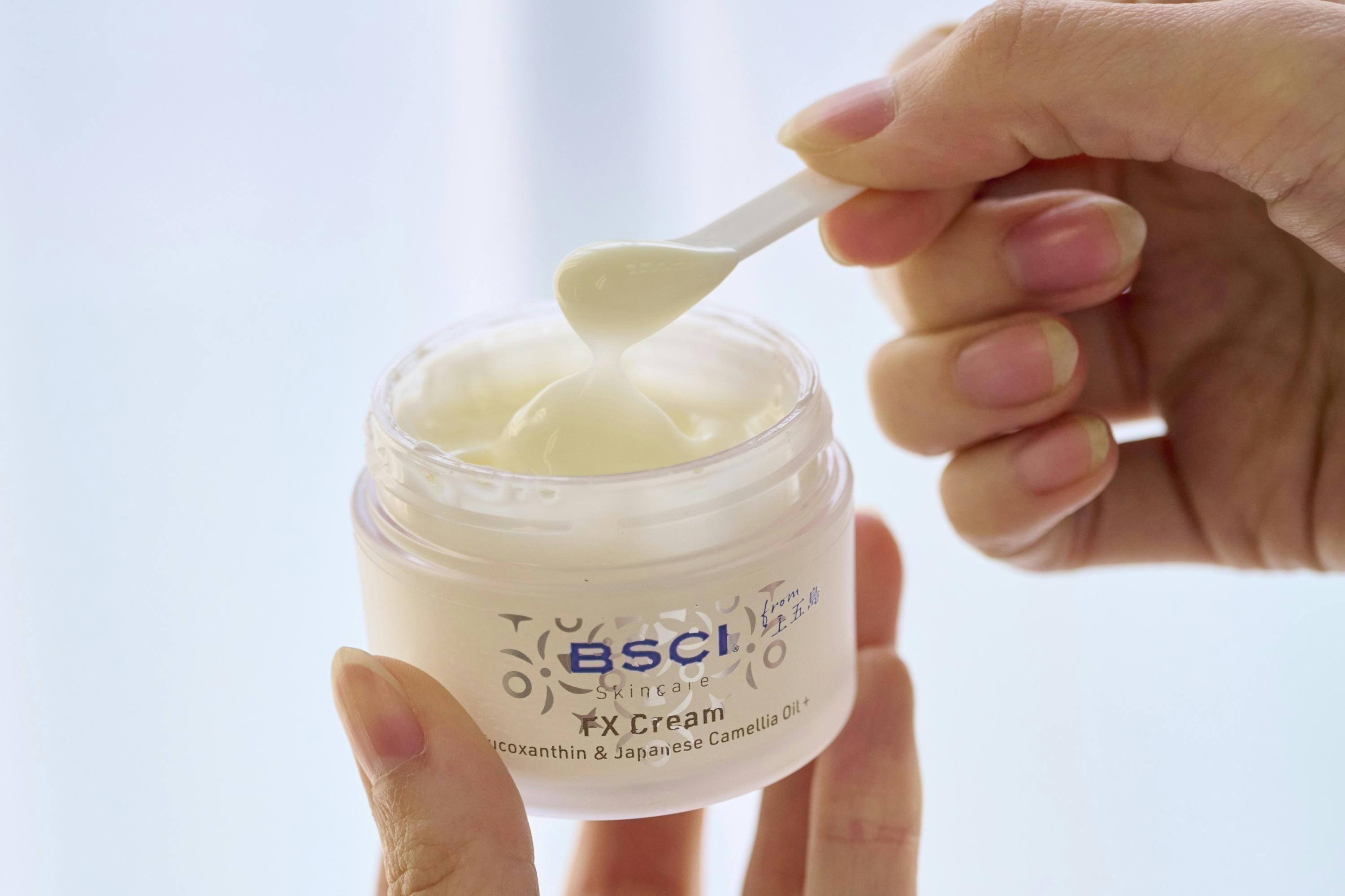 5年の研究開発を経て、完成したフコキサンチン配合の健康食品 marica Fx(右)、貴重な椿油とフコキサンチンを配合したFxセラム(中)とFxクリーム(左)