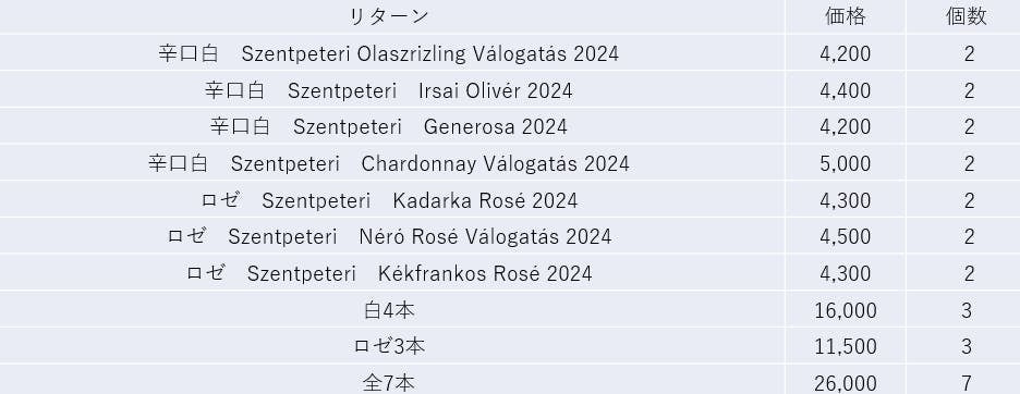 今回の輸入本数はほとんどが1種につき30本ですので、1本もののリターンは2つずつに絞り、ロゼ3種セット、白4種セットを3つずつ、ロゼと白の7種セットを7つにしています。