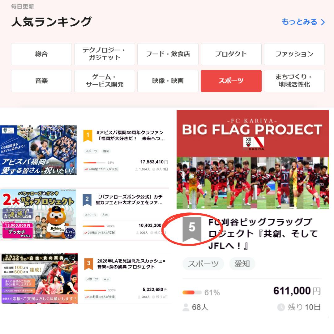 クラウドファンディングビッグフラッグプロジェクトへ温かいご支援をいただき、ありがとうございます!まだ支援するかどうか迷われている方も、ご興味を持っていただきありがとうございます。現在、クラウドファンディングサービス「CAMPFIRE」のスポーツカテゴリーランキングで、なんと5位にランクインしました!これもひとえに、皆様からの熱い想いが集まった結果です。ご支援いただいた皆様、本当にありがとうございます!「一人ひとりの想いを託したビッグフラッグ」の実現まで、あと一歩です!このプロジェクトをさらに多くの方に広めるために、皆様のご協力が必要です。このビッグフラッグが試合会場で掲げられた時、皆様の想いが一つになり、大きな力となって選手たちを後押しします。この感動的な瞬間を、一緒に創り上げたいです!一人ひとりのFC刈谷への熱い想いを、ぜひこのビッグフラッグに託してください。プロジェクト終了まで残り10日です。皆様のご支援が、このクラブの未来への大きな一歩となります。プロジェクトの詳細はこちらからご確認ください!https://camp-fire.jp/projects/865175/view引き続きビッグフラッグプロジェクトへの熱いご支援とご協力をよろしくお願いいたします。