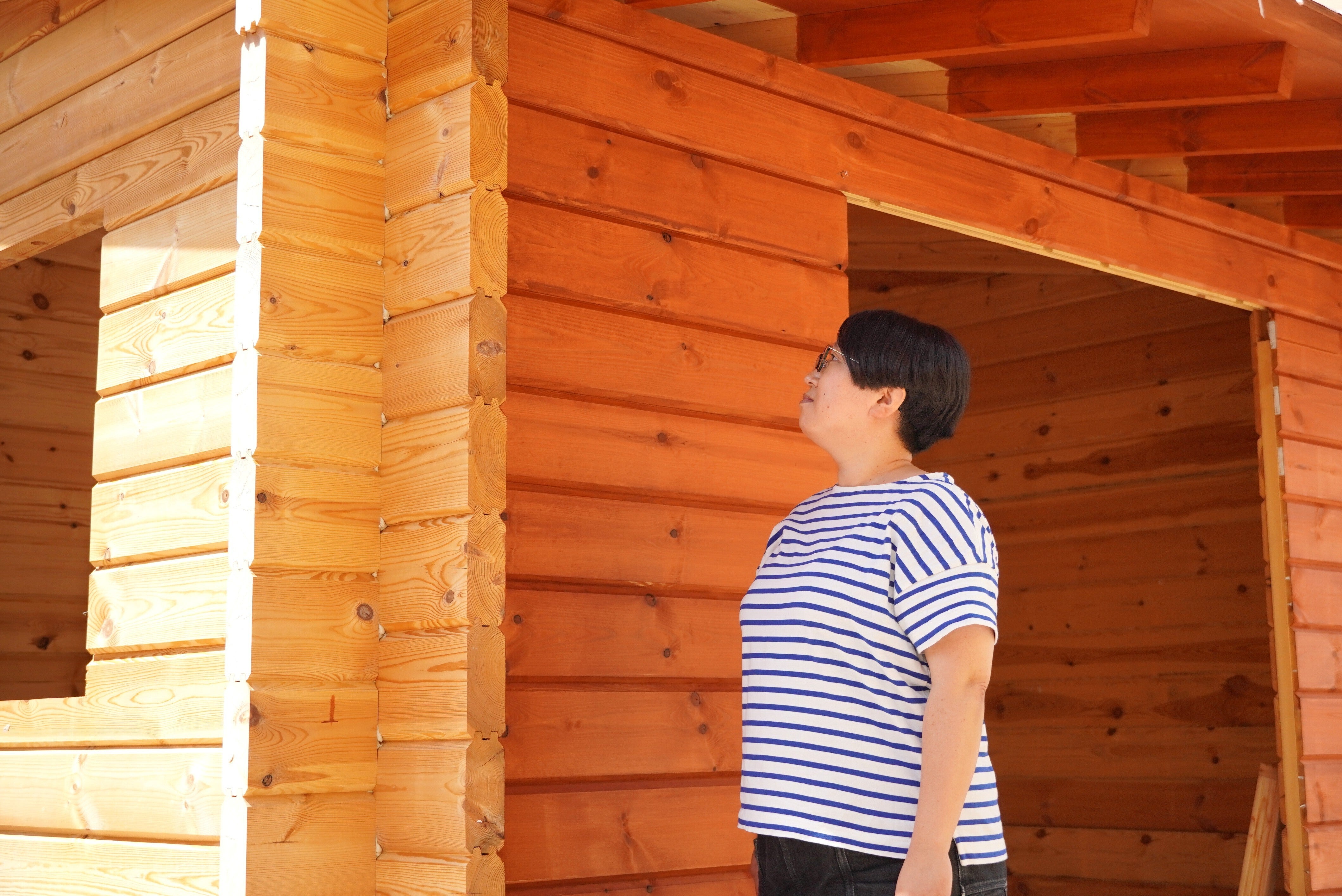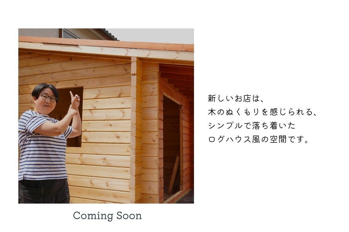 新しいお店は、木のぬくもりを感じられる、シンプルで落ち着いたログハウス風の空間です。木の素材感を活かすことで、訪れる皆さんが落ち着いたナチュラルな雰囲気の中で過ごせるような場所にしたいと思っています。