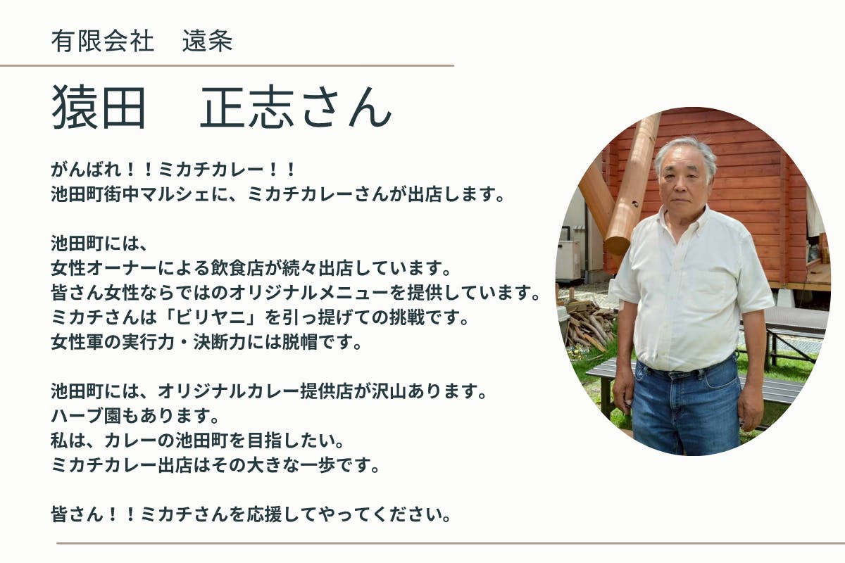 皆様に池田町「ミカチカレー」でお会いできる日を心待ちにしつつ、どうか温かいご協力をお願いいたします。