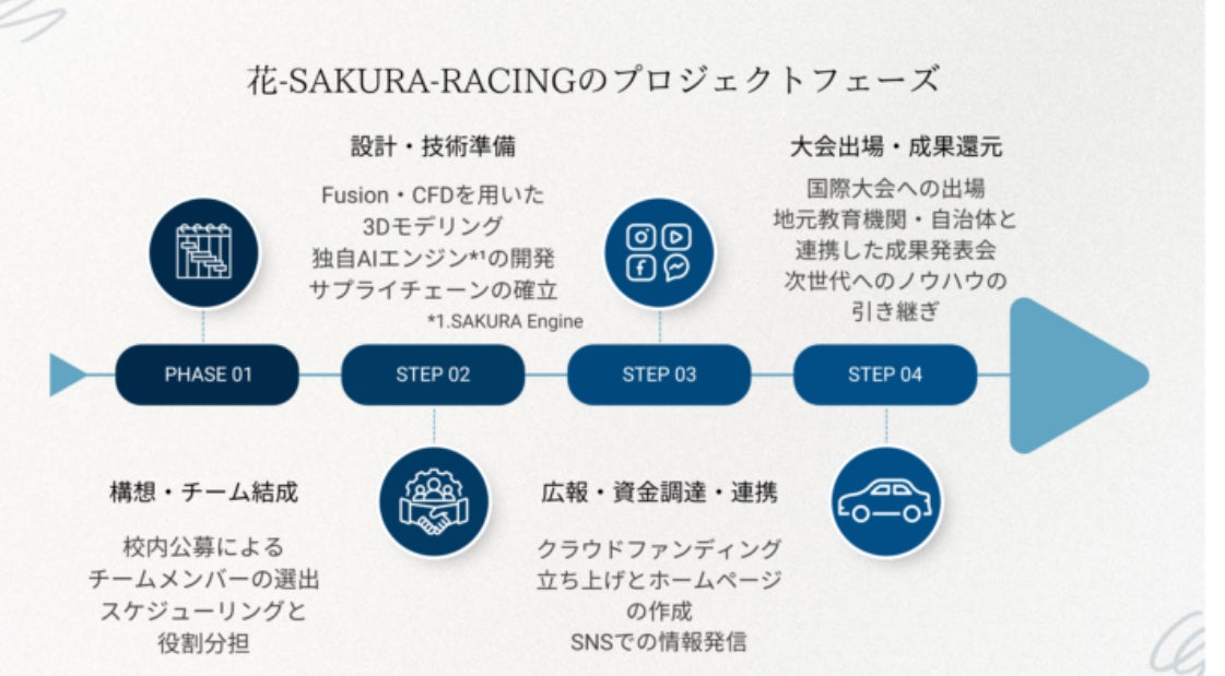 ※本プロジェクトは、私たちの在籍する高校の探究活動の一環として行っており、「花-SAKURA-Racing」のプロジェクトオーナーは、本プロジェクトを顧問としてサポートしてくださっております、本校探究活動推進室長の河内満先生です。