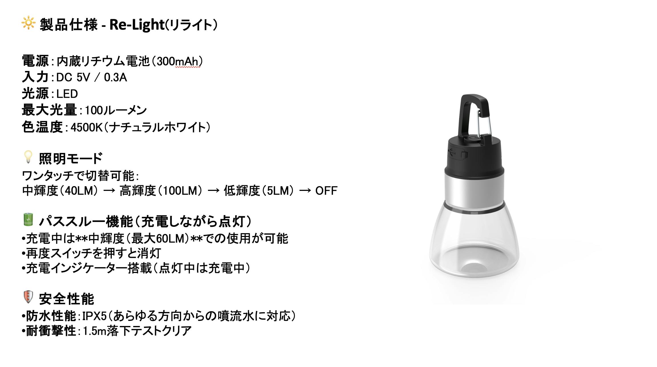 ReLightは、ただのライトではありません。再利用・再点灯・再発見の意味を込めて、「光との新しいつながり」を提案するツールです。皆さんのご支援で、より多くの人に「やさしい光」が届きますように。