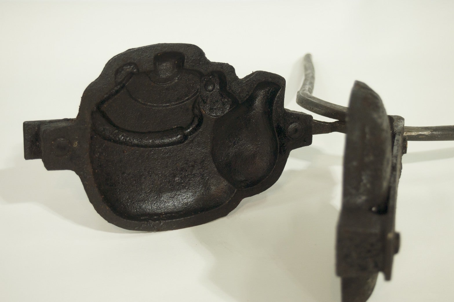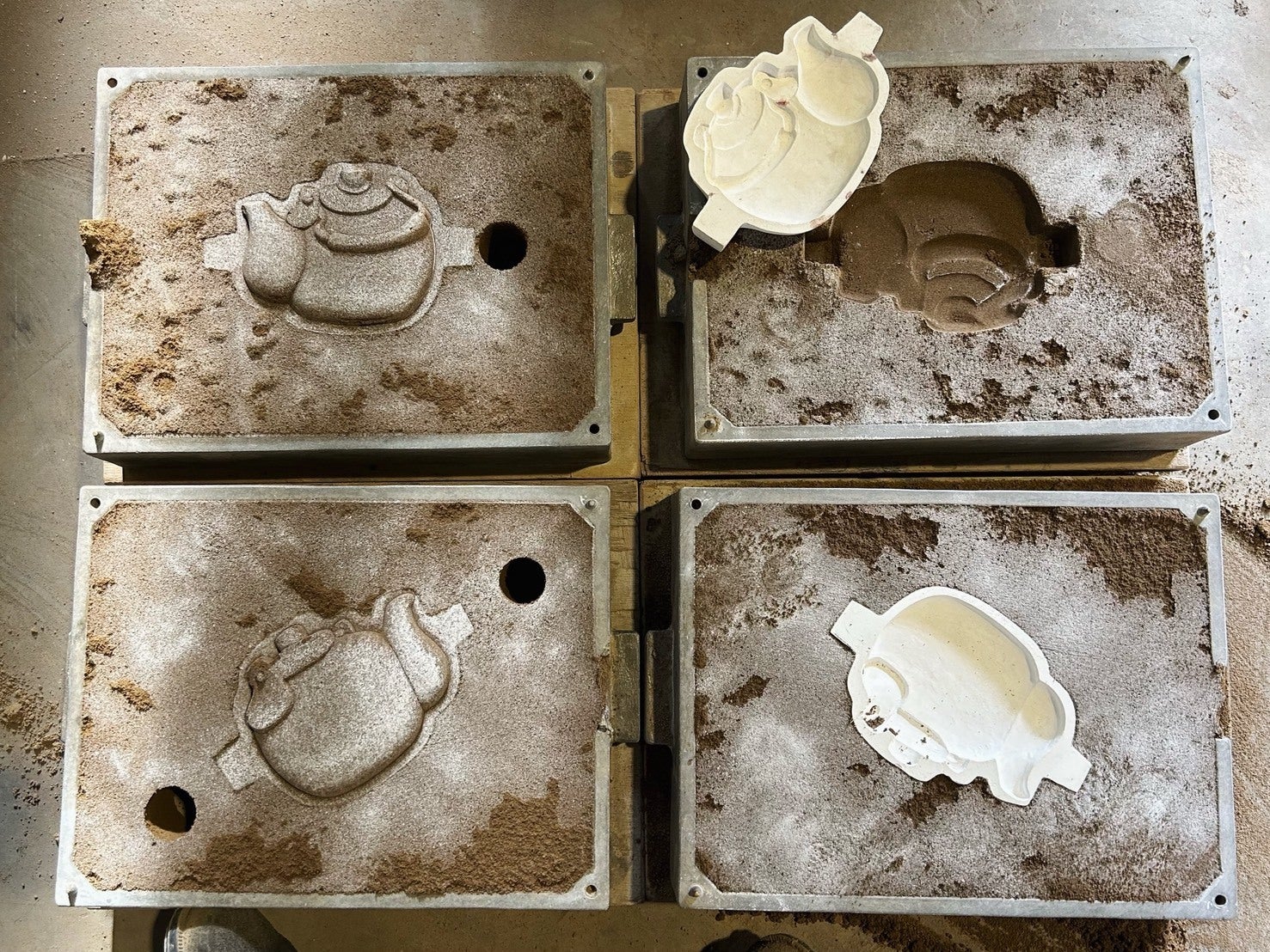 この技法は鋳型に鋳物砂を用いて、焼成せず、その「生」のまま鋳造するので「生型」と呼ばれています。この技法のメリットは、鋳物砂がくりかえし使用でき、一つの原型から数個以上の製品を作り出せる点にあります。