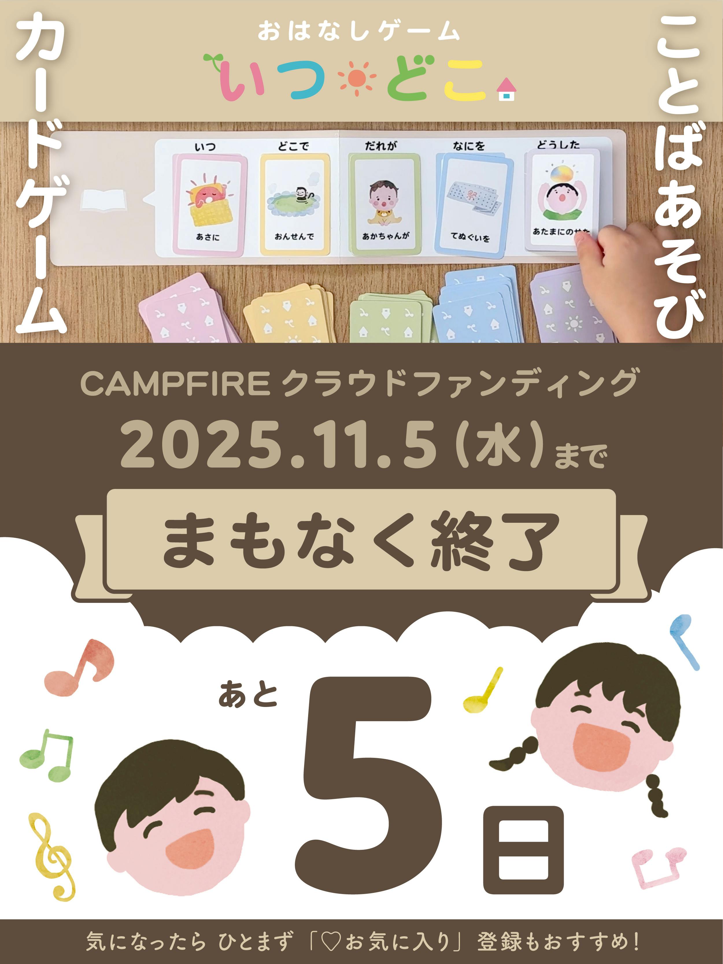 いつもあたたかいご支援をありがとうございます。ことばの発達を願い作った【おはなしゲーム いつどこ】クラウドファンディングいよいよラスト2日となりました。_________________目標金額 500,000円現在の支援総額 444,850円のこり 55,150円________________ゲーム1個のスタンダードプラン【 3600円 】を【 16名以上 】の方にご支援いただければ達成となります。引き続き、お出かけ先の集まりや、お休み明けの登園時、職場、LINEなどでご紹介いただけますと大きな力になります。SNSでは、支援者さまのひとことを添えてのRT、シェアなどでラストスパートを一緒に盛り上げていただけますと励みになります。あと少し、どうぞよろしくお願いいたします。