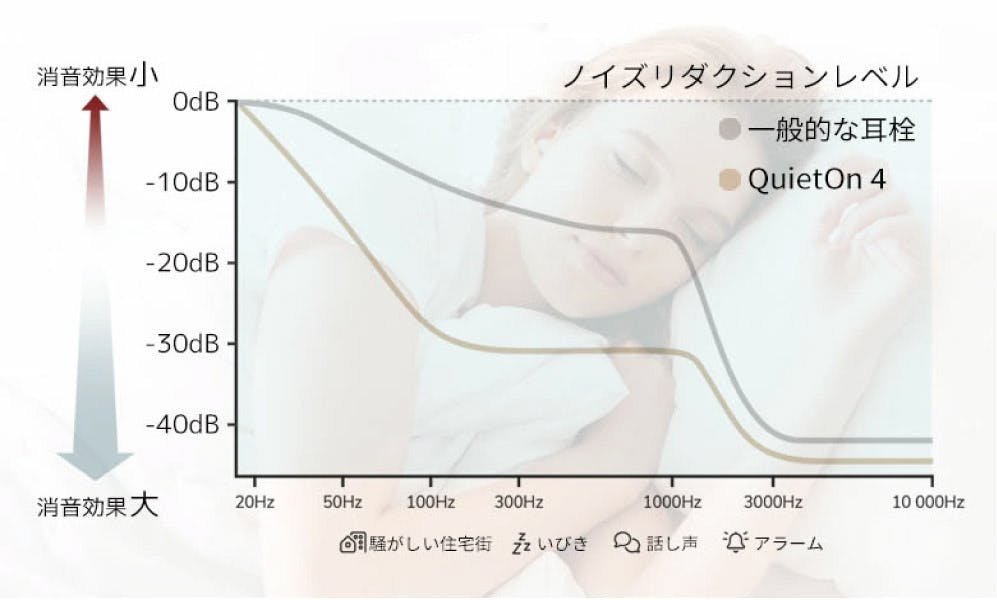 Quiet On 4に搭載されたノイズキャンセリング機能は、一般的な耳にいれるだけのウレタン耳栓では効果のなかった、いびきなどや住宅街の騒音などの低周波騒音の音を見つけて低減することができます。