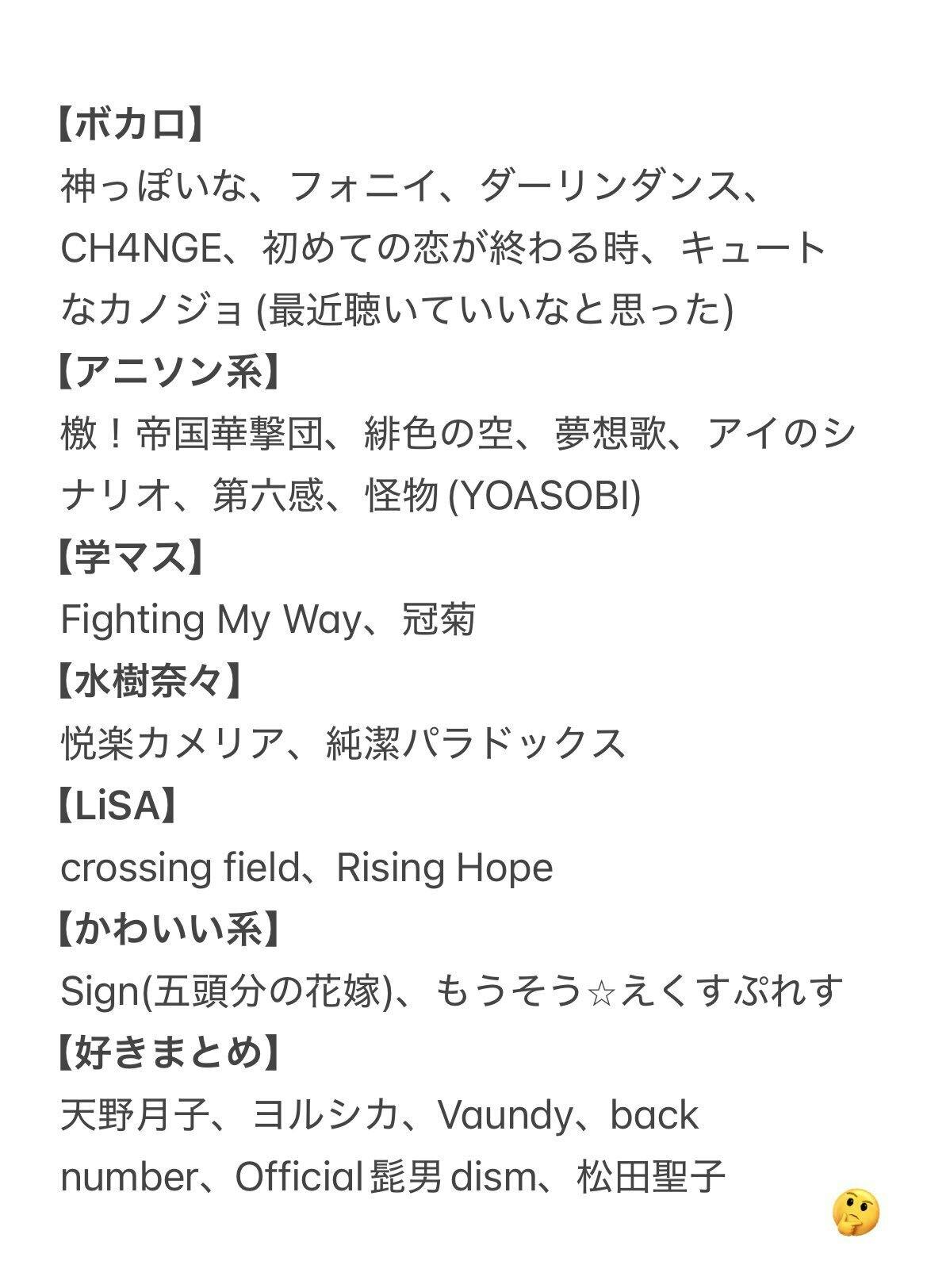 いただいたリクエスト曲、自分で歌おうと決めている曲の全体バランスを見てセトリを組ませていただきます!リクエストは応えられるだけ応える予定ですが、私の歌唱力的な問題でお応えできないものがあったらごめんなさい><練習たくさん頑張ります!!