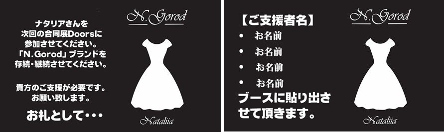 9月に開催中の合同展Doors東京にナタリアさんの「N.Gorod」ブランドが出展しています。彼女の活動を支えるために、11月に合同展Doorsを継続開催します。皆様のご支援が多ければ、再度ナタリアさんを特別参加してもらうことが出来ます。ぜひご支援ください。そして一緒に会場で開催しませんか?