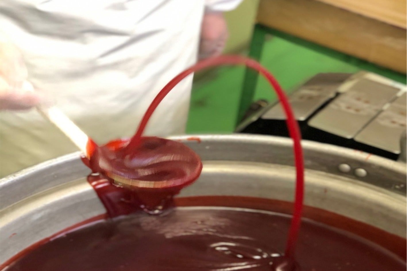 ※老伴の最中に流すために、紅羊羹をすくっている様子