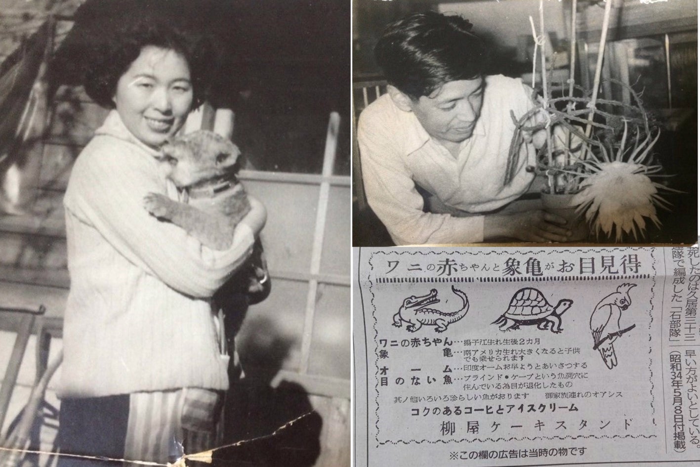 ※左:ライオンの子を抱く祖母、右上:月下美人を開花させた祖父、右下:昭和に飼っていた動物の記事