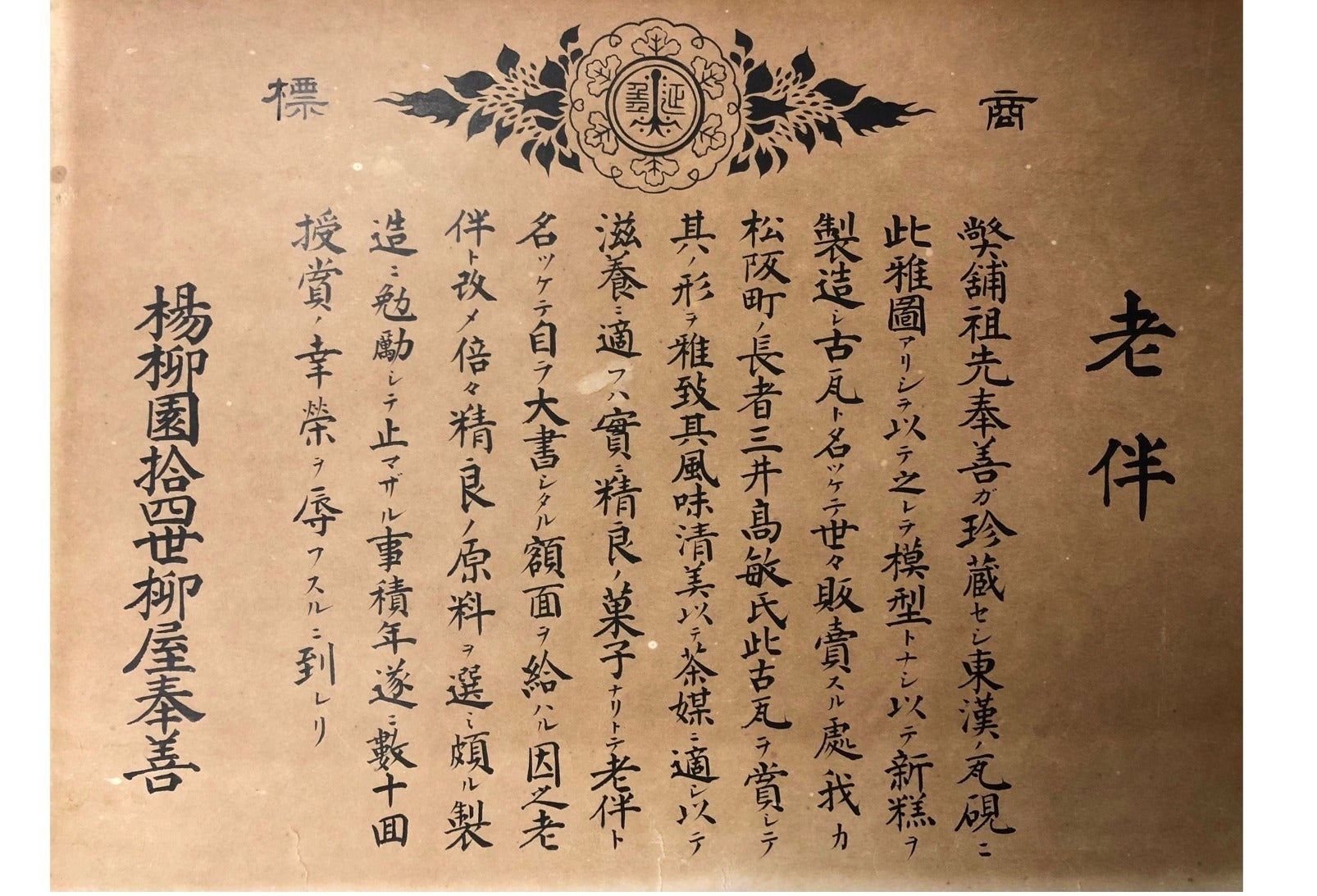 柳屋奉善は、安土桃山時代に近江国、蒲生郡 日野町 にて創業し、戦国大名・蒲生氏郷公へお茶菓子を献上したことを起点に、450年の歴史を刻んできました。そのお茶菓子は江戸時代に「老伴(おいのとも)」の名を三井家七代目・三井高敏公より賜り、明治以降は皇室にも度々お納めする機会をいただくなど、松阪を代表する老舗和菓子店として歩んできました。