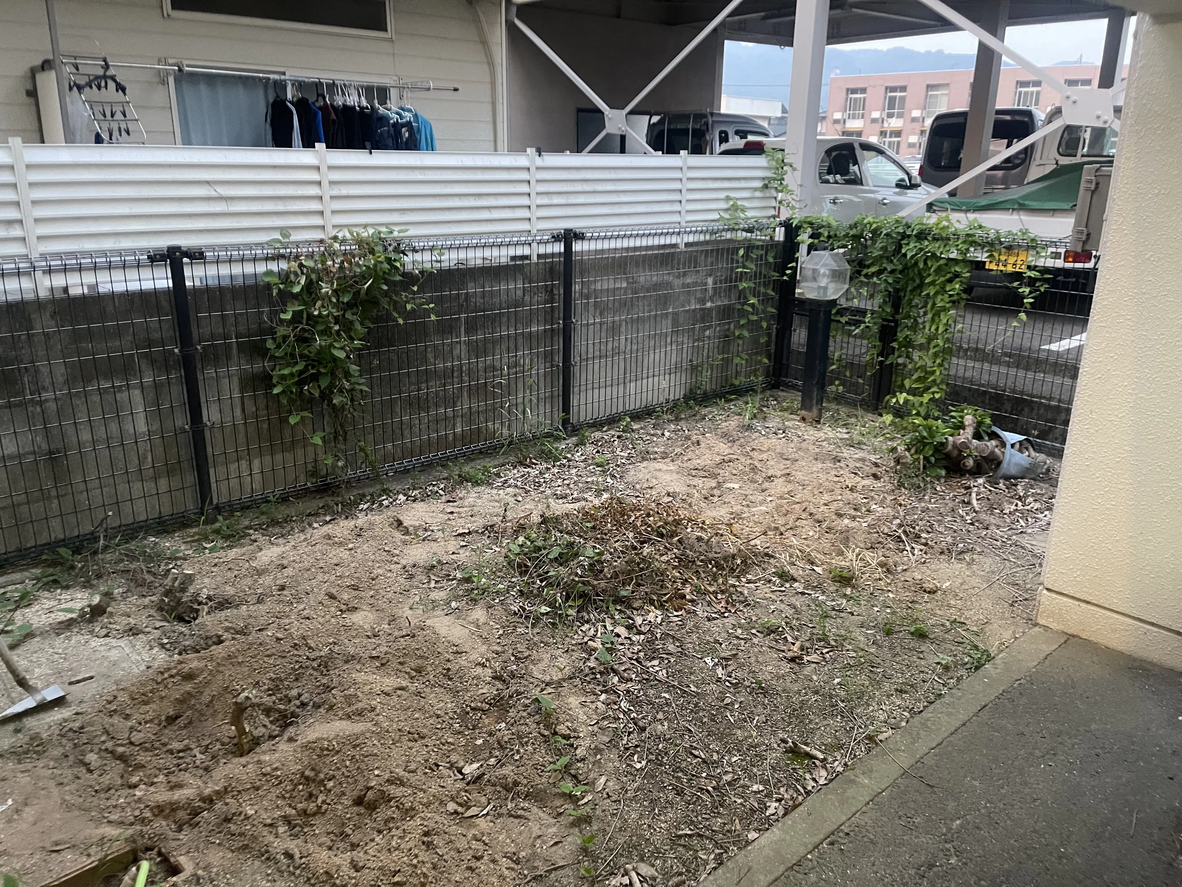 施設1階は駐車場になっていて、奥の方の駐車スペースと植物が生えていたスペースを改修し、芝生にしたいと思っています。現状までの整備も自分たちで行っております。