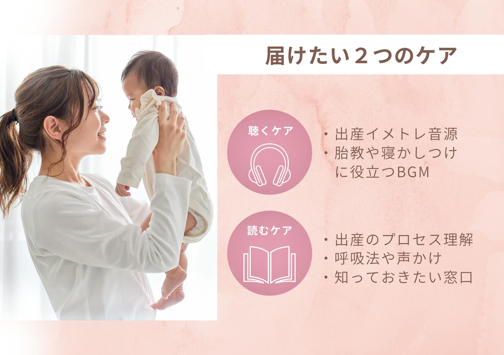 読むケアは、ハンドブックではなくチラシからQRを読み取ってpdfまたはwebページにアクセスできるような形を想定しています。そこでイメトレ音源とのアクセス連携をすることで、聴く・読むの両輪で出産準備のサポートができればと考えています。