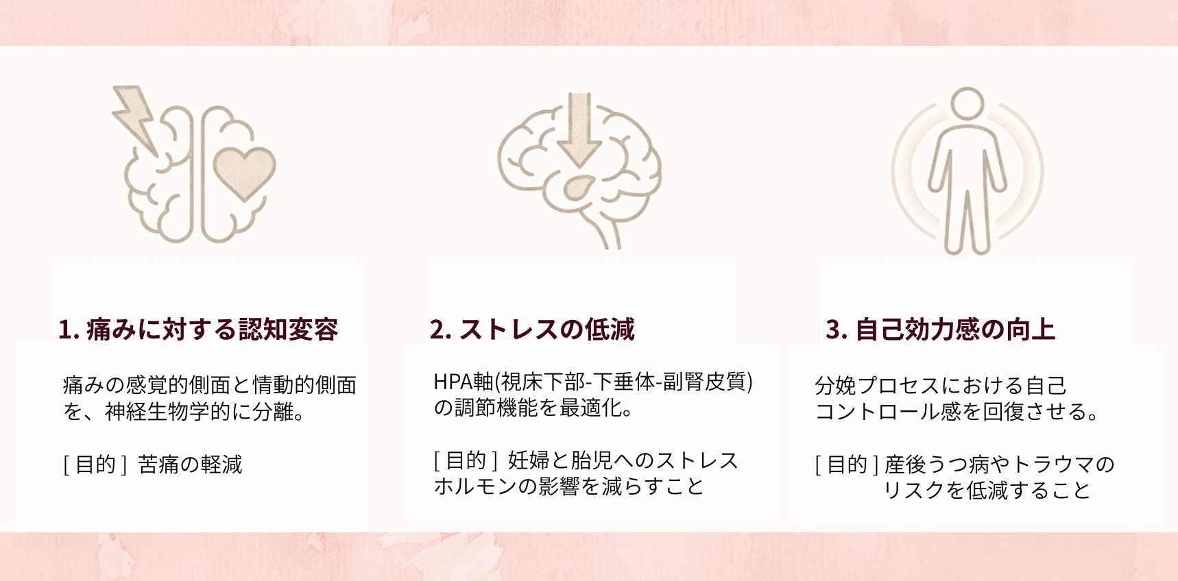 マインドフルネスの出産準備プログラム(MBCP)の研究では、痛みの感覚と感情を切り離す「脱カップリング」や、ストレスホルモン抑制が母子に良い好影響があることを神経生物学的な視点から示されており、産後うつ予防やレジリエンス向上が期待できます。